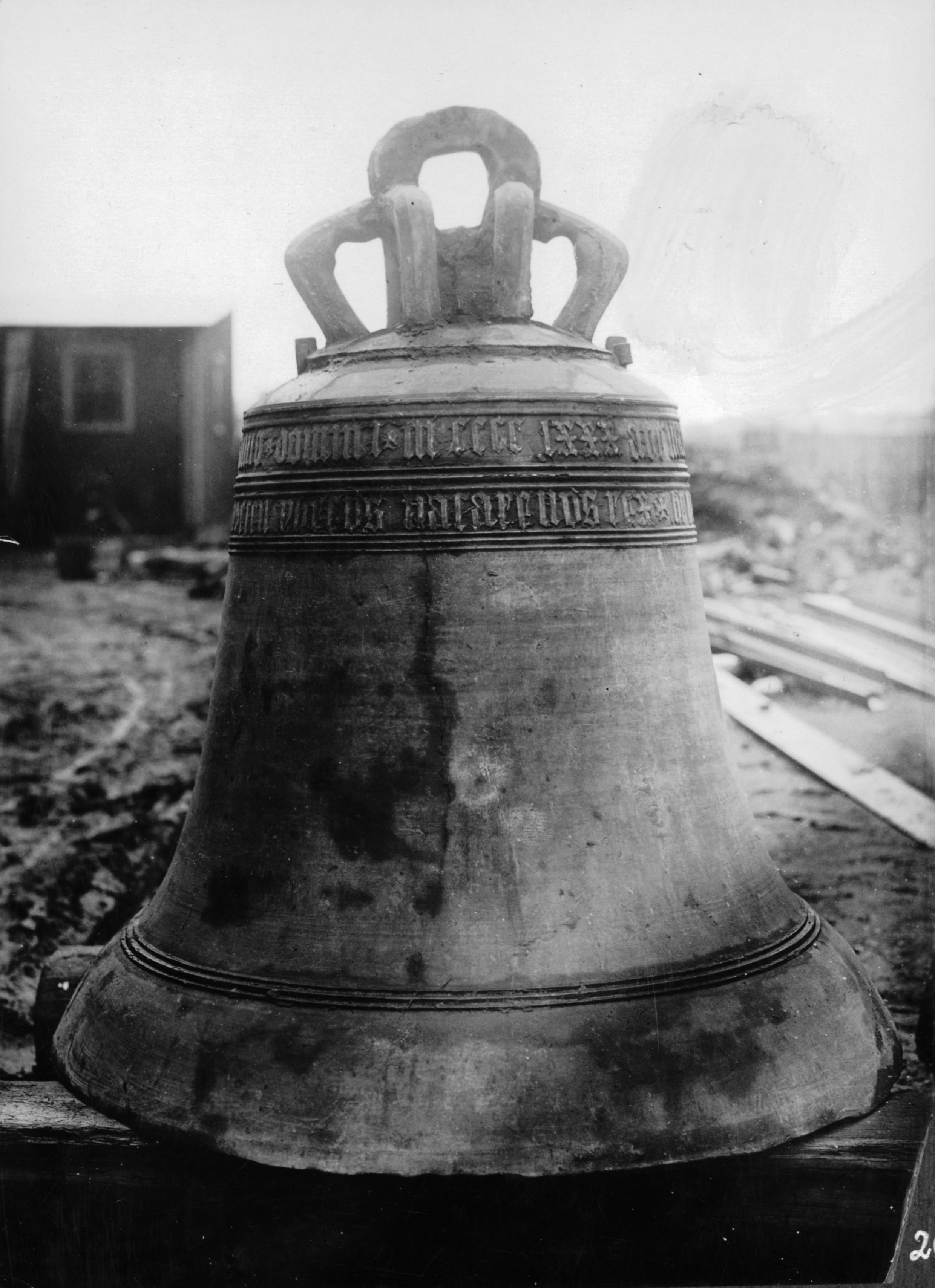 Klocka av malm, dubbla skriftband. Gjuten av M. & O. Olssons klockgjuteri, Ystad.