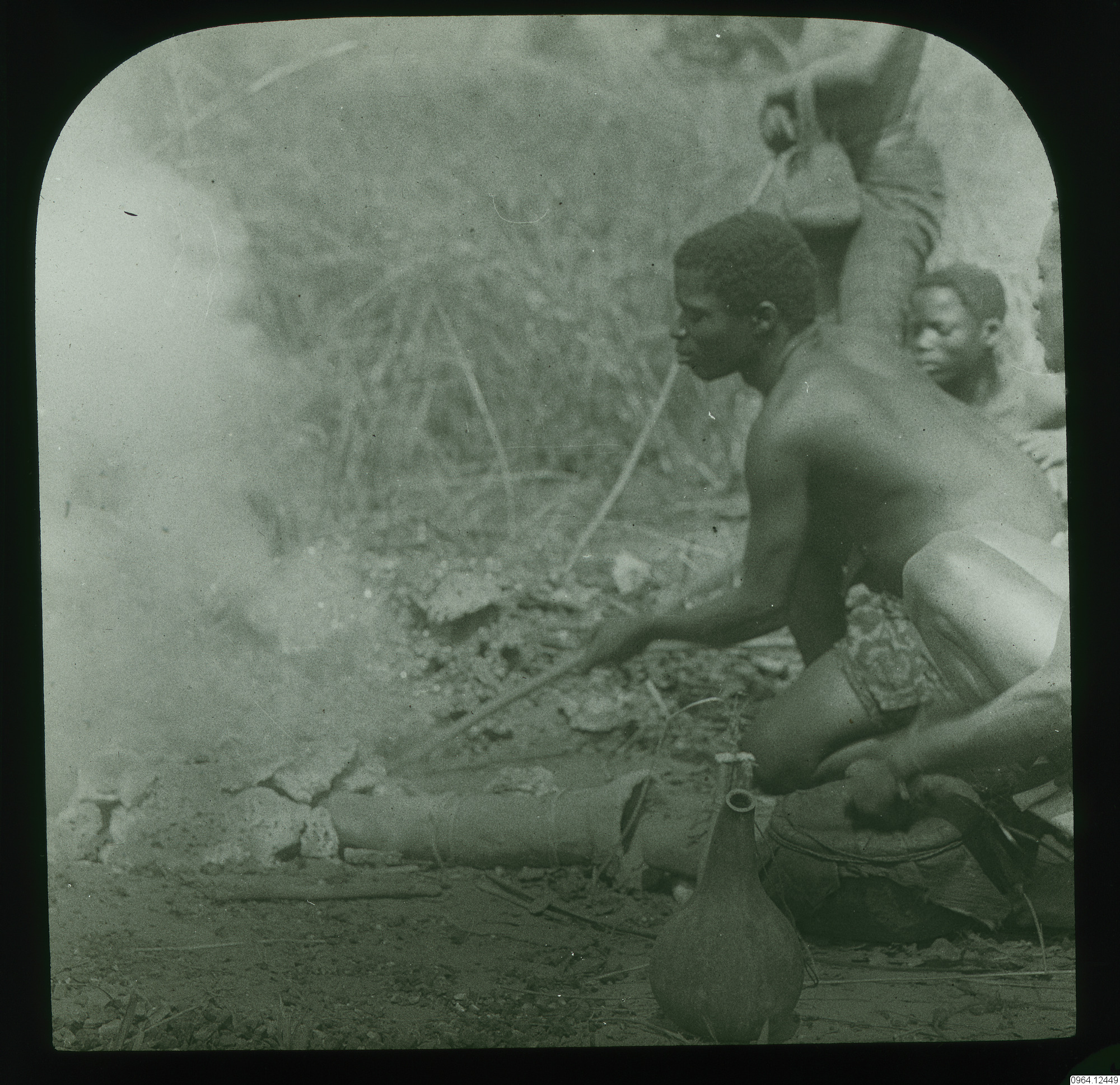 Man som sitter vid eld. Järnframställning? Matlagning? Bredvid en kalebass.
