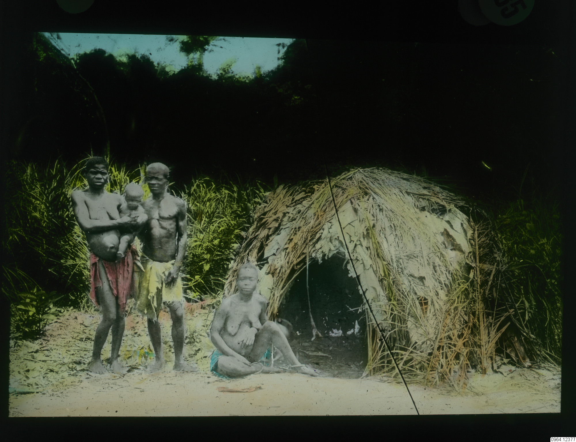 Utanför en liten hydda sitter en kvinna. En kvinna med barn står och en man.