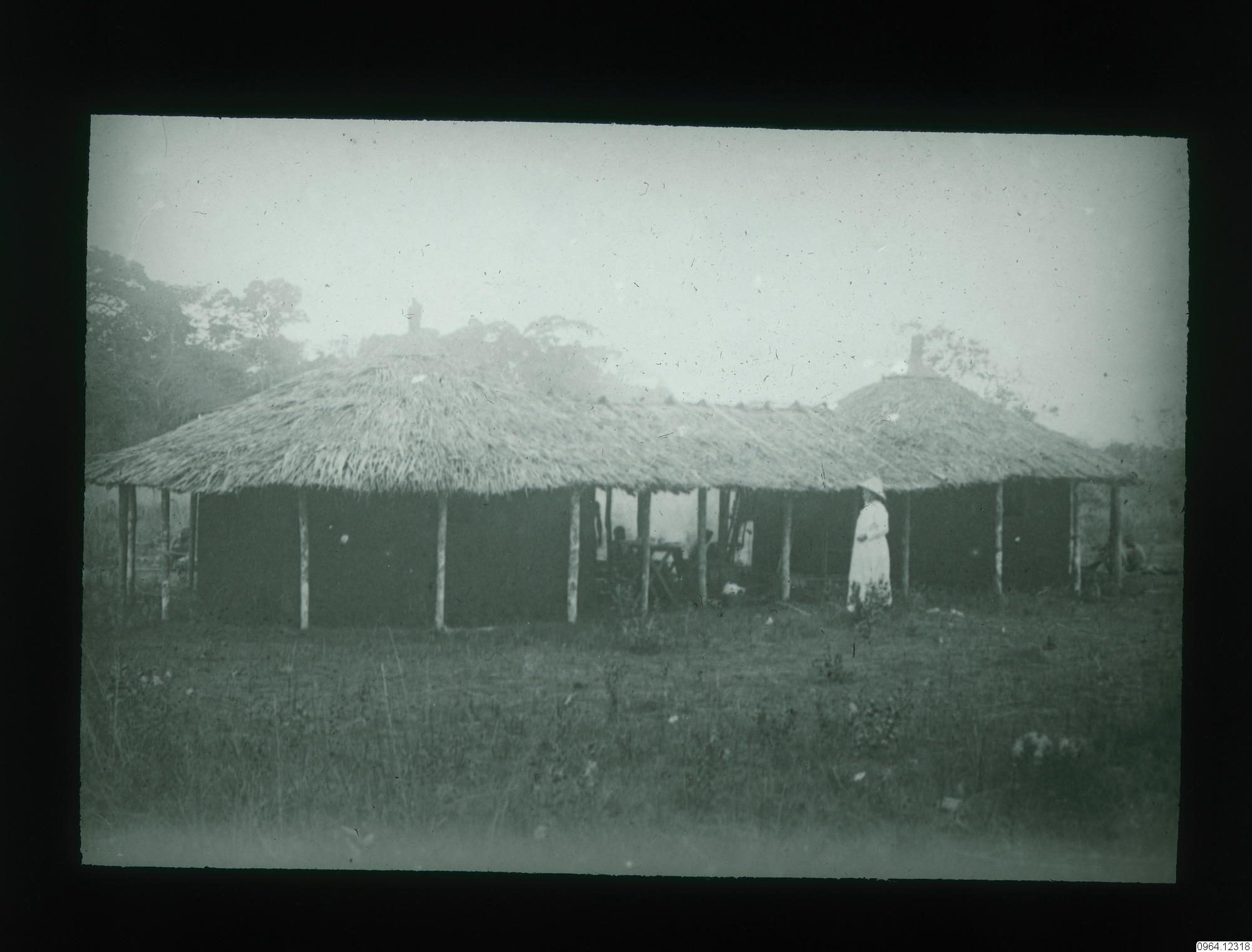 Kvinnlig missionär utanför hydda/hus. Byggnaden är två hyddor som förenas av ett tak.