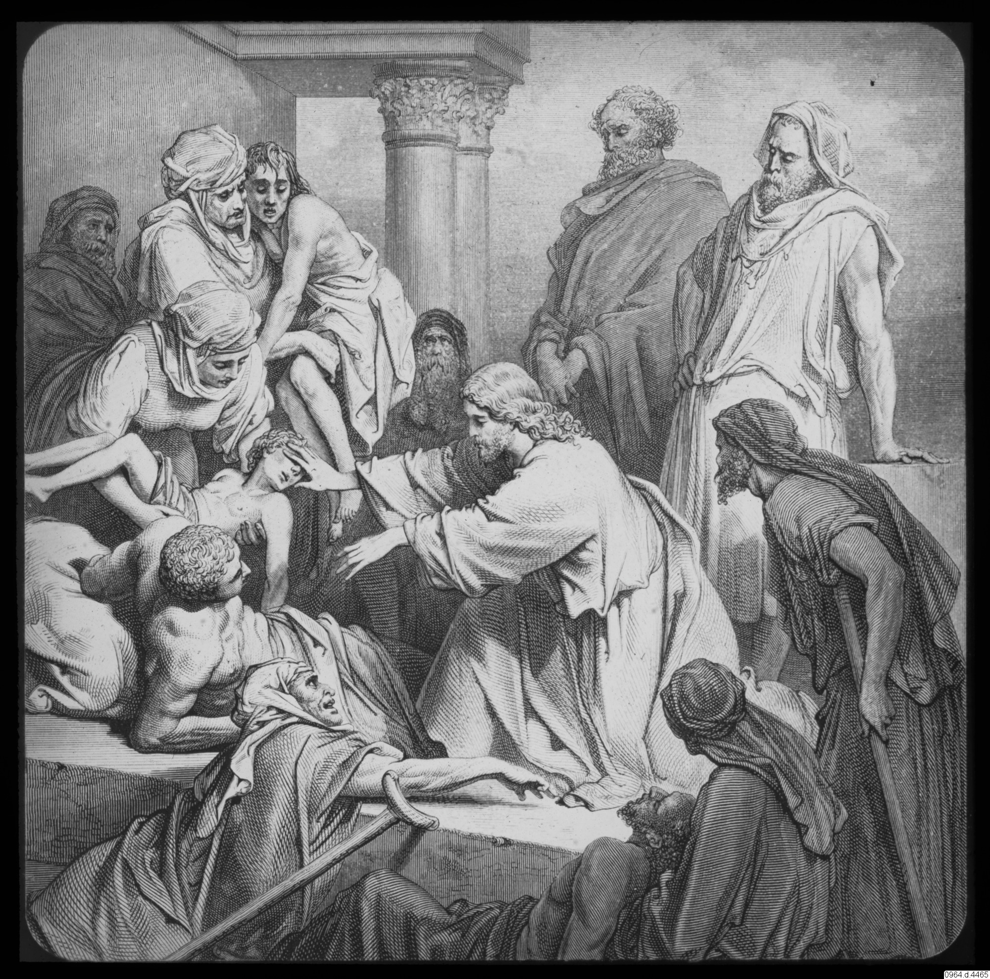Jesu liv. Jesus botar sjuka. Matt. 15:29-35. Markus 1:29-39. Från Gustav Dore's bibel.