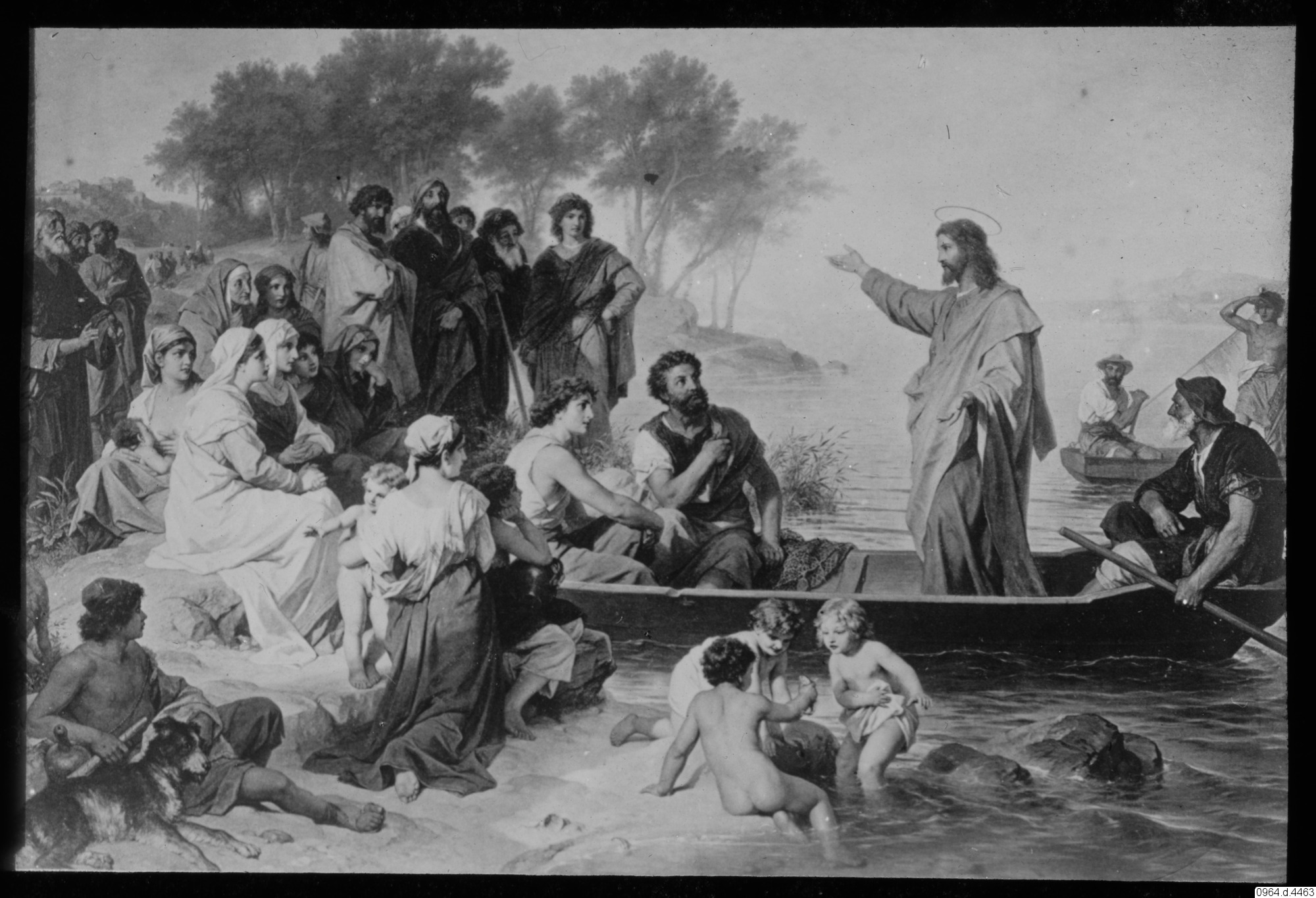 Jesu liv. Jesus i båten predikande för folket. Matt. 14:13-34.