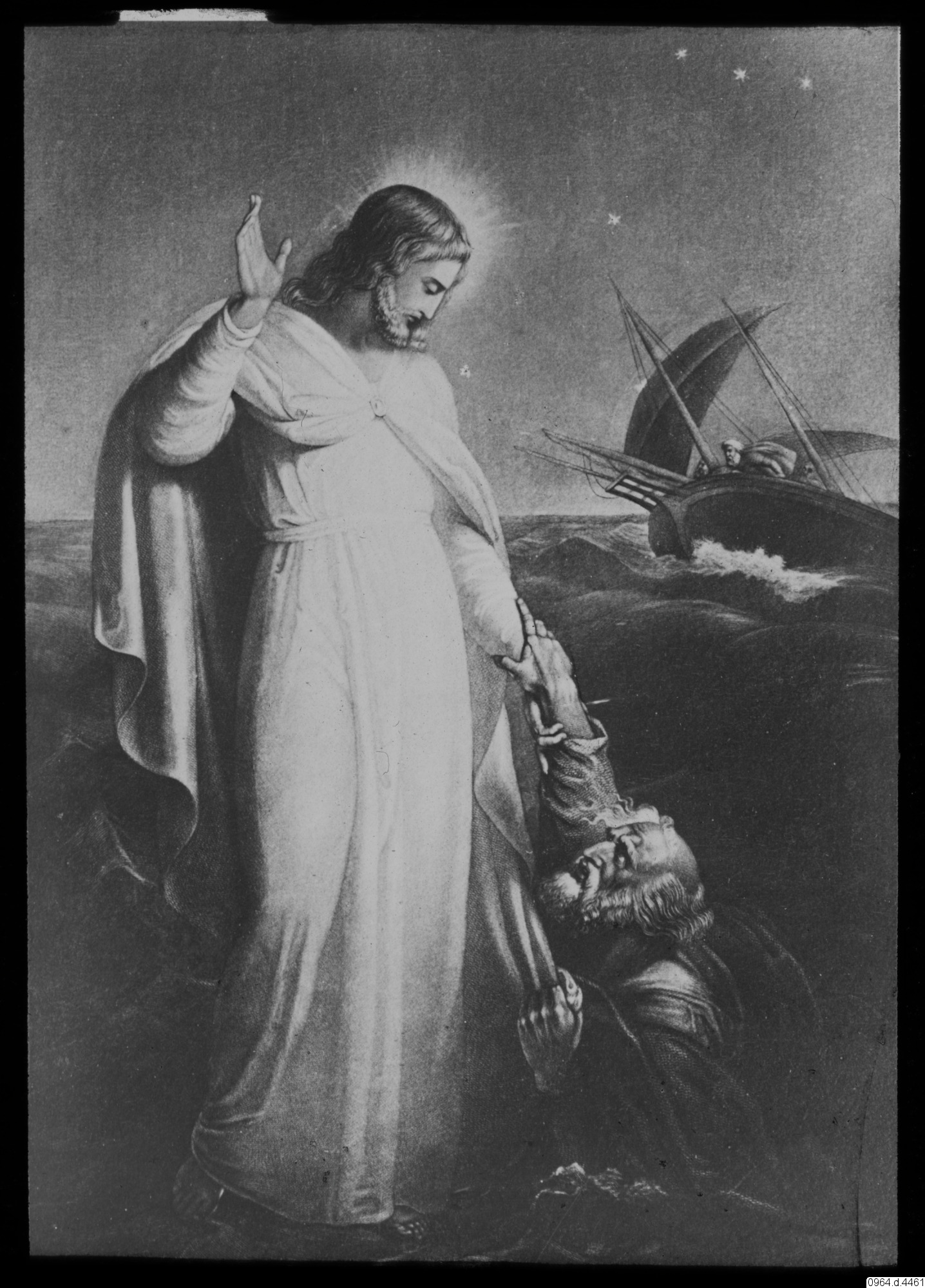 Jesu Liv. (Jesus går på vattnet, Galileiska sjön.) Den sjunkande Petrus. Joh. 6:16-21. Matt. 14:22-34. Mark. 6:45-52.