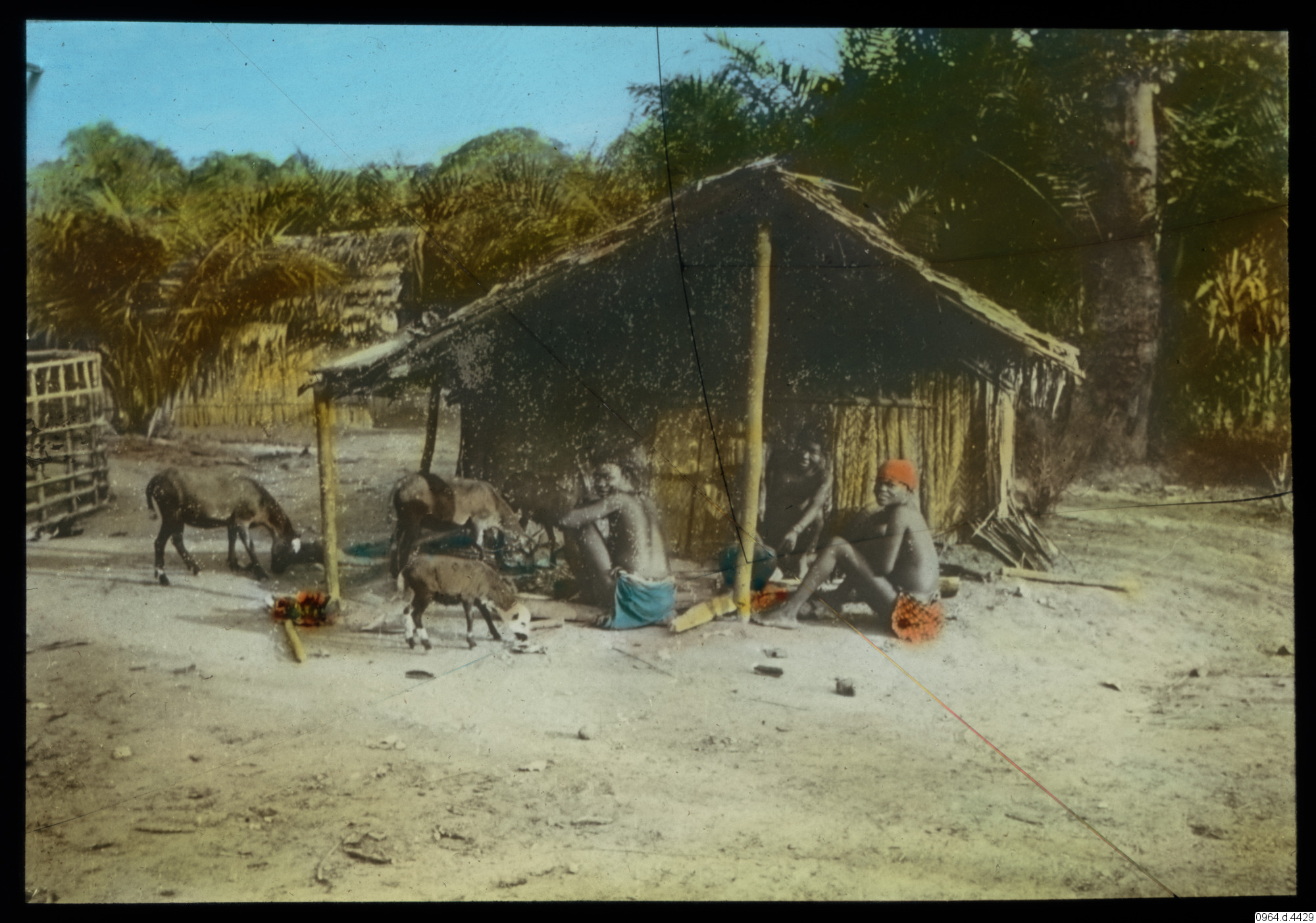 eld, palmer, byggnader, hyddor, gruppbild, fotografi, photograph
