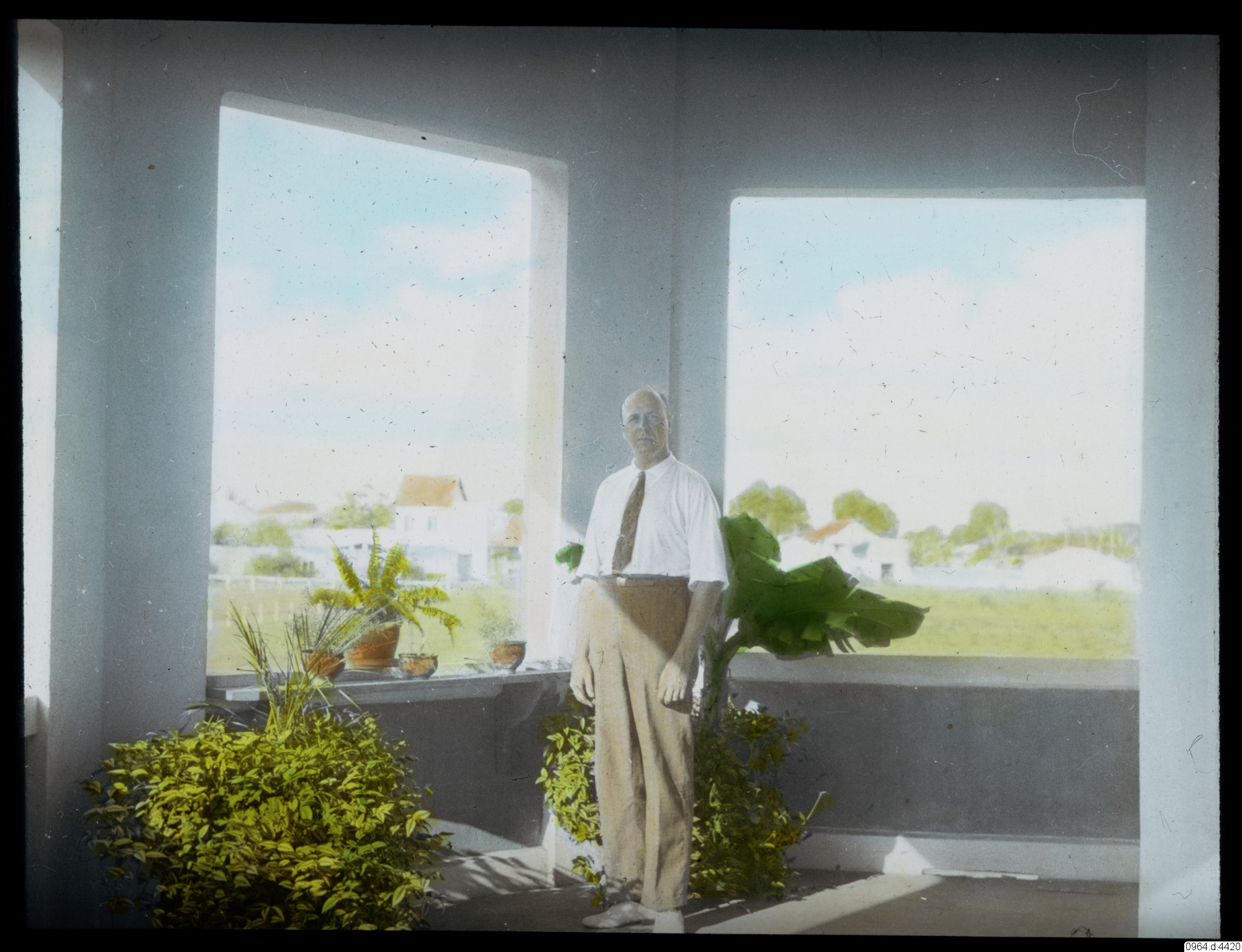 veranda, krukväxter, byggnader, hus, missionsstation, man, fotografi, photograph