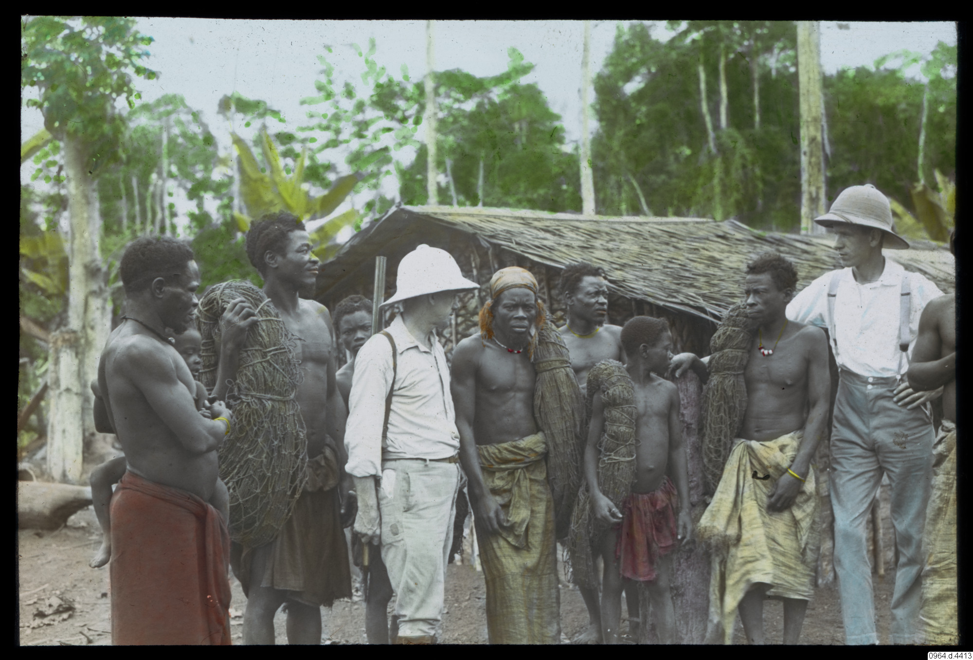 Missionärer och män med jaktnät framför hydda. Foto: J. Öhrneman.