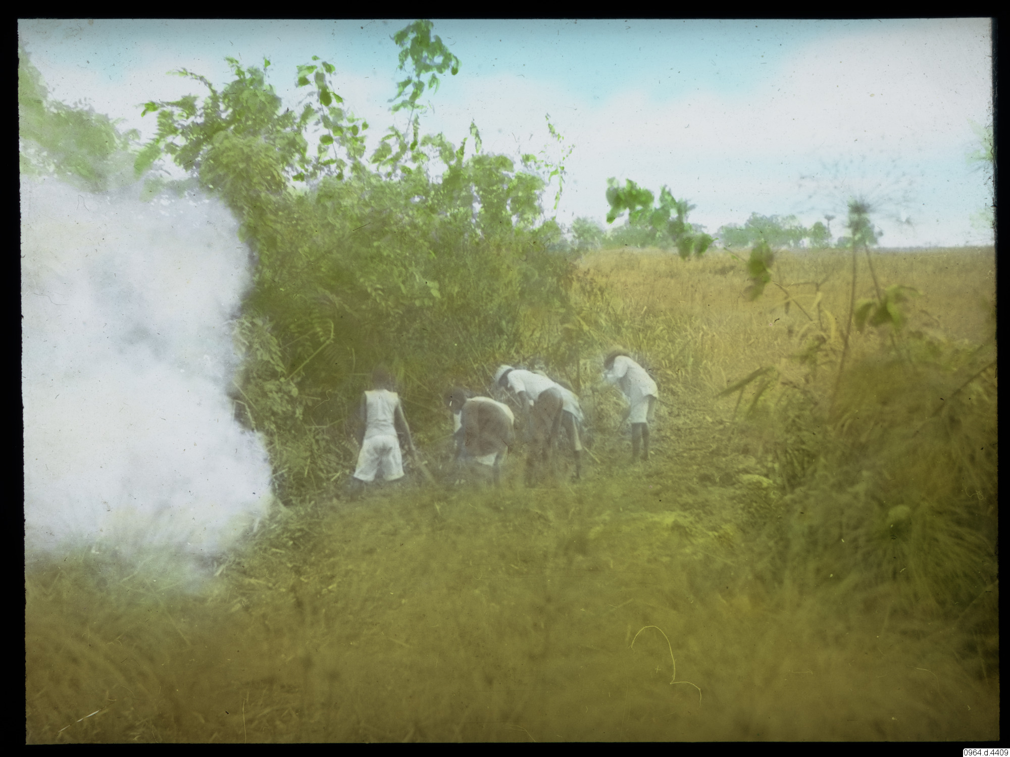 Pojkar som arbetar i växtlighet och stort rökmoln. Röjning eller svedjebruk?
