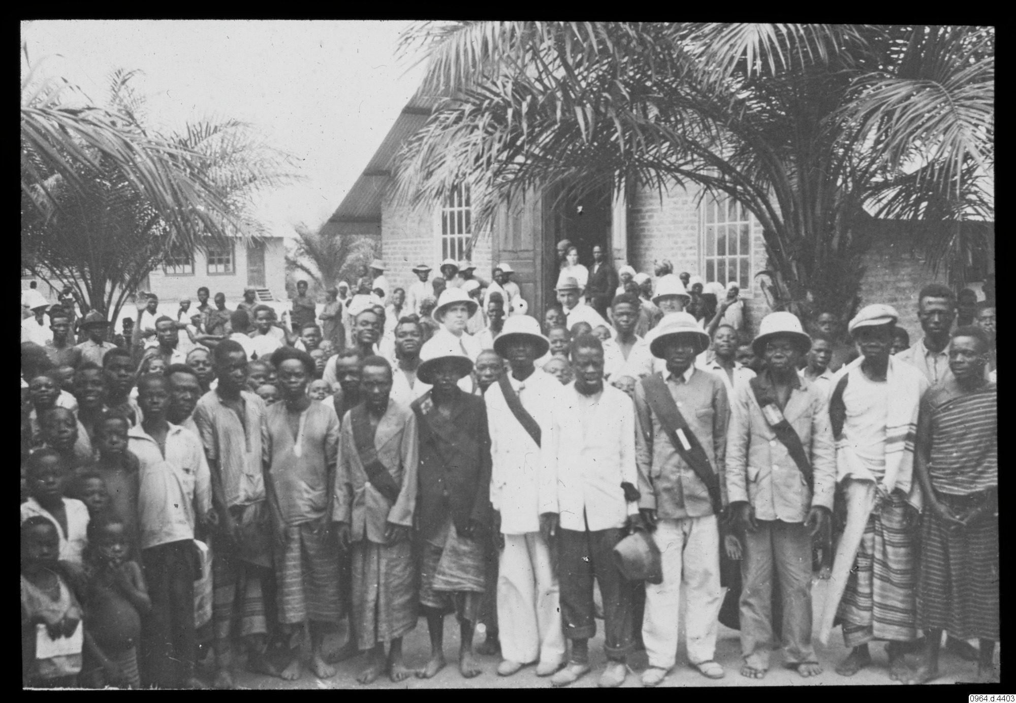 missionärer, byggnad, missionsstation, kyrka, hattar, folksamling, fotografi, photograph