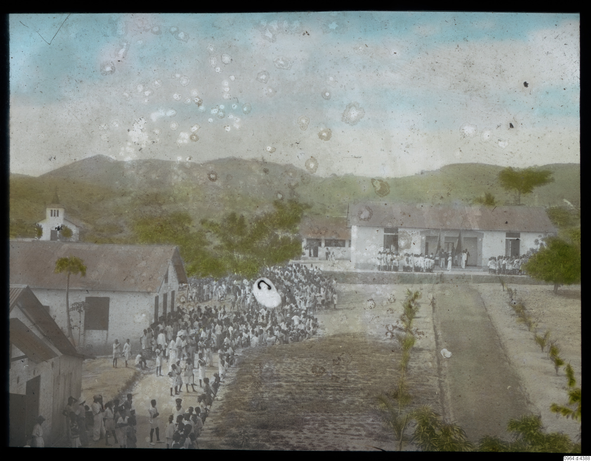 folksamling, byggnader, möte, barn, kyrka, flaggor, fotografi, photograph