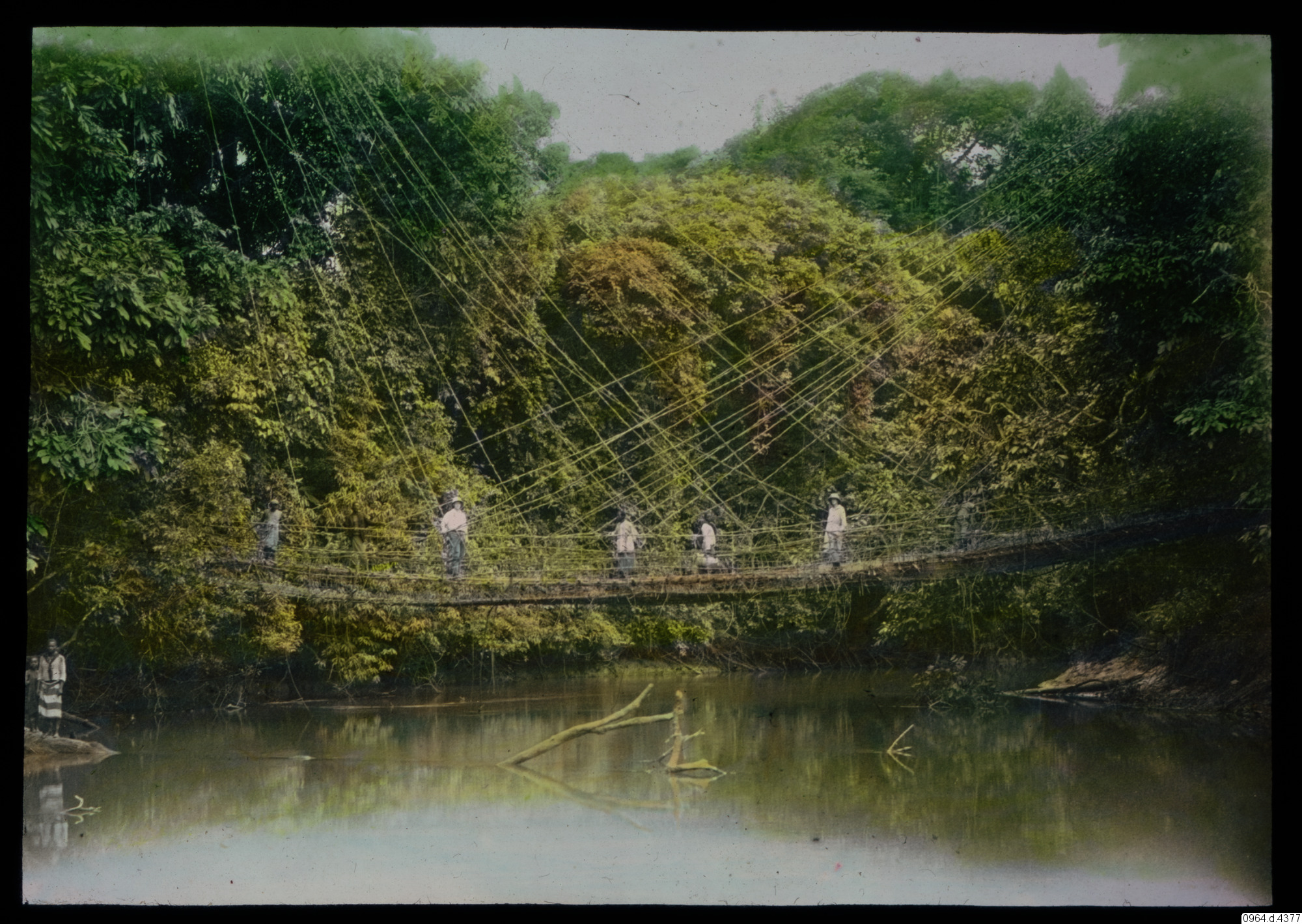 missionärer, hängbro, vattendrag, träd, grenar, gruppbild, fotografi, photograph