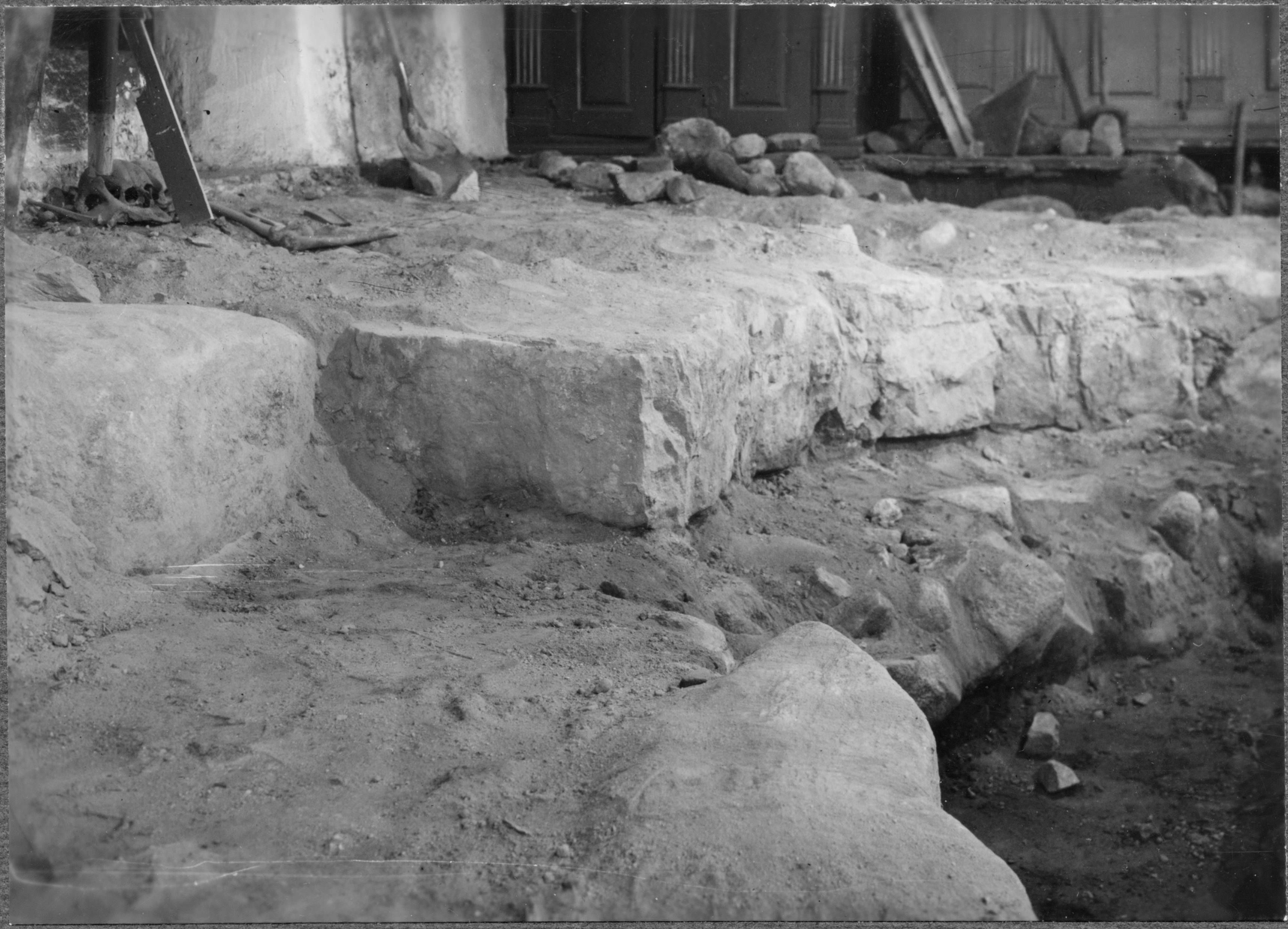 Utgrävning i kyrkan. Absiden från sydöst. Hörnet mot koret.