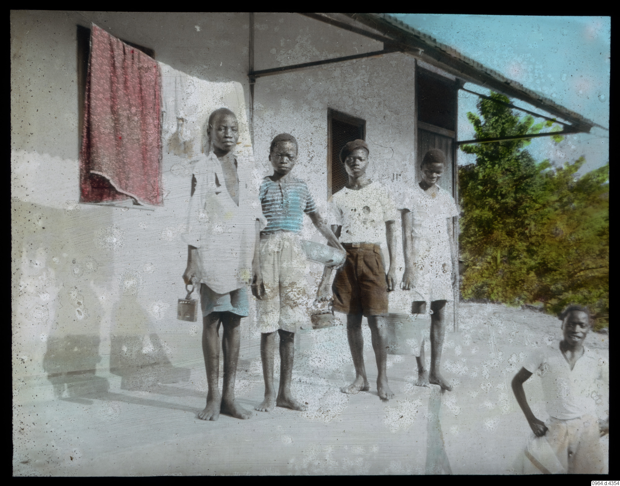 gruppbild, tvättlina, byggnad, pojkar, barn, hink, fotografi, photograph