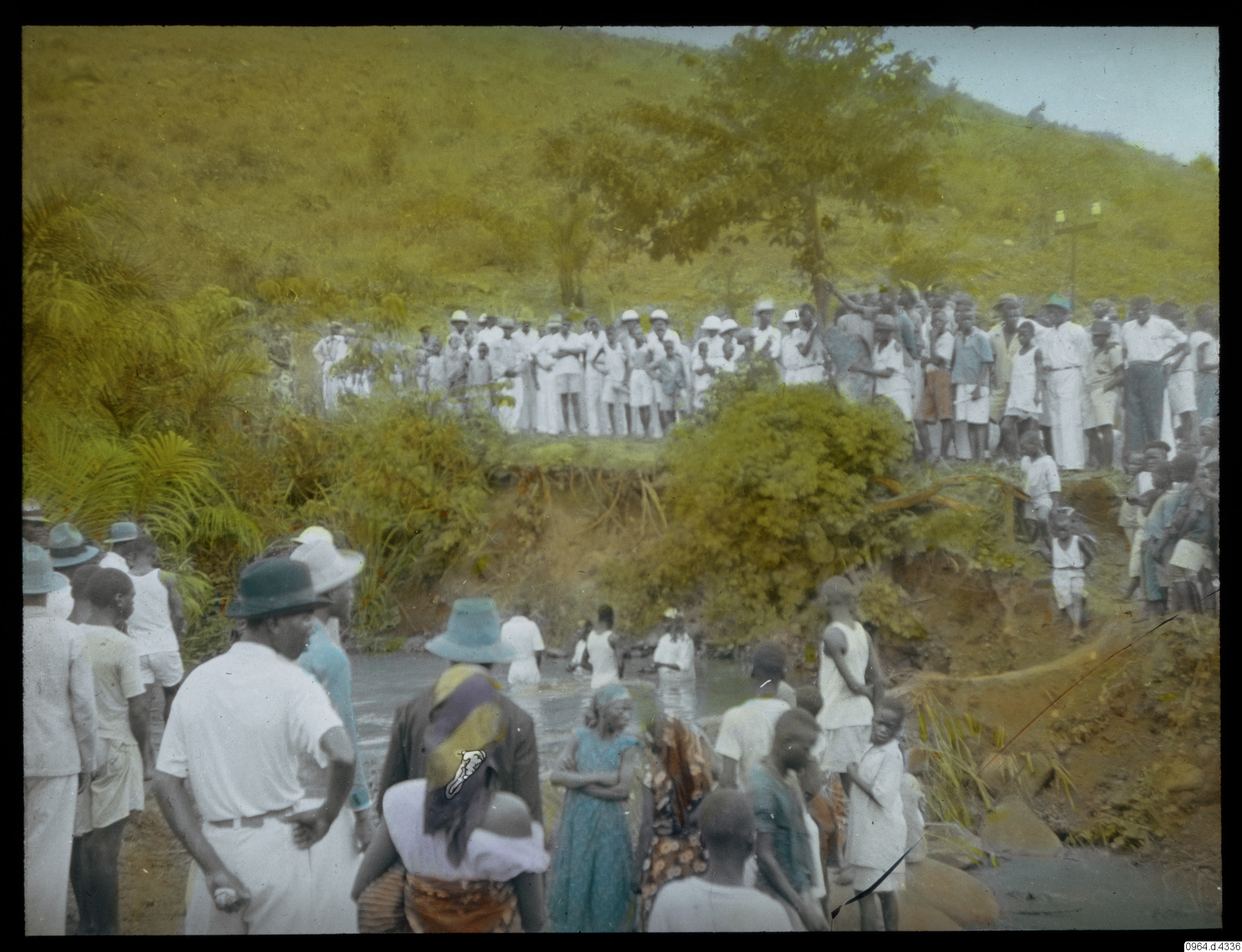 Församling som bevittnar ett dop, i en damm.