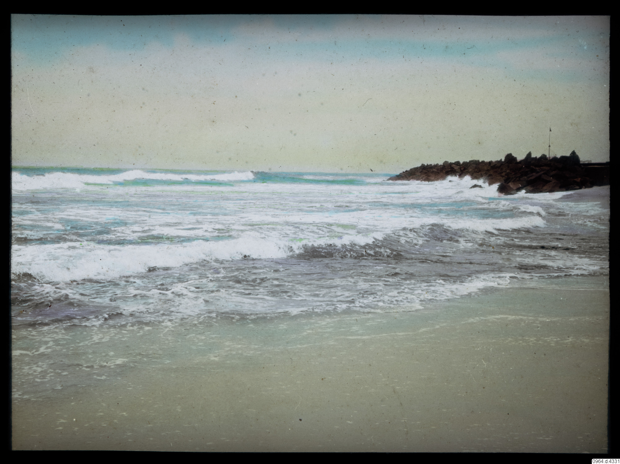 Havsstrand med vågor som slår in över sanden och klippor. Byggnader i bakgrunden.
