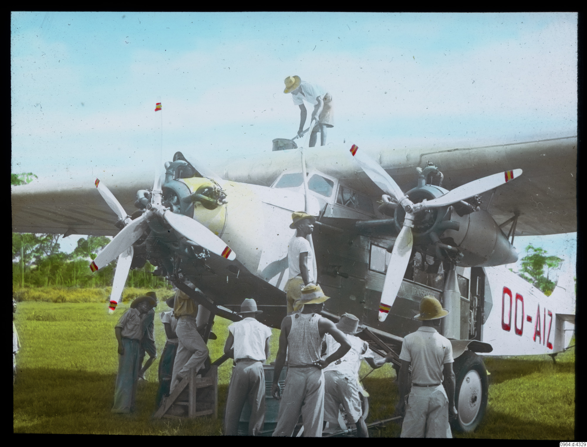 Folksamling vid flygplan. Man på taket som tankar bränsle.