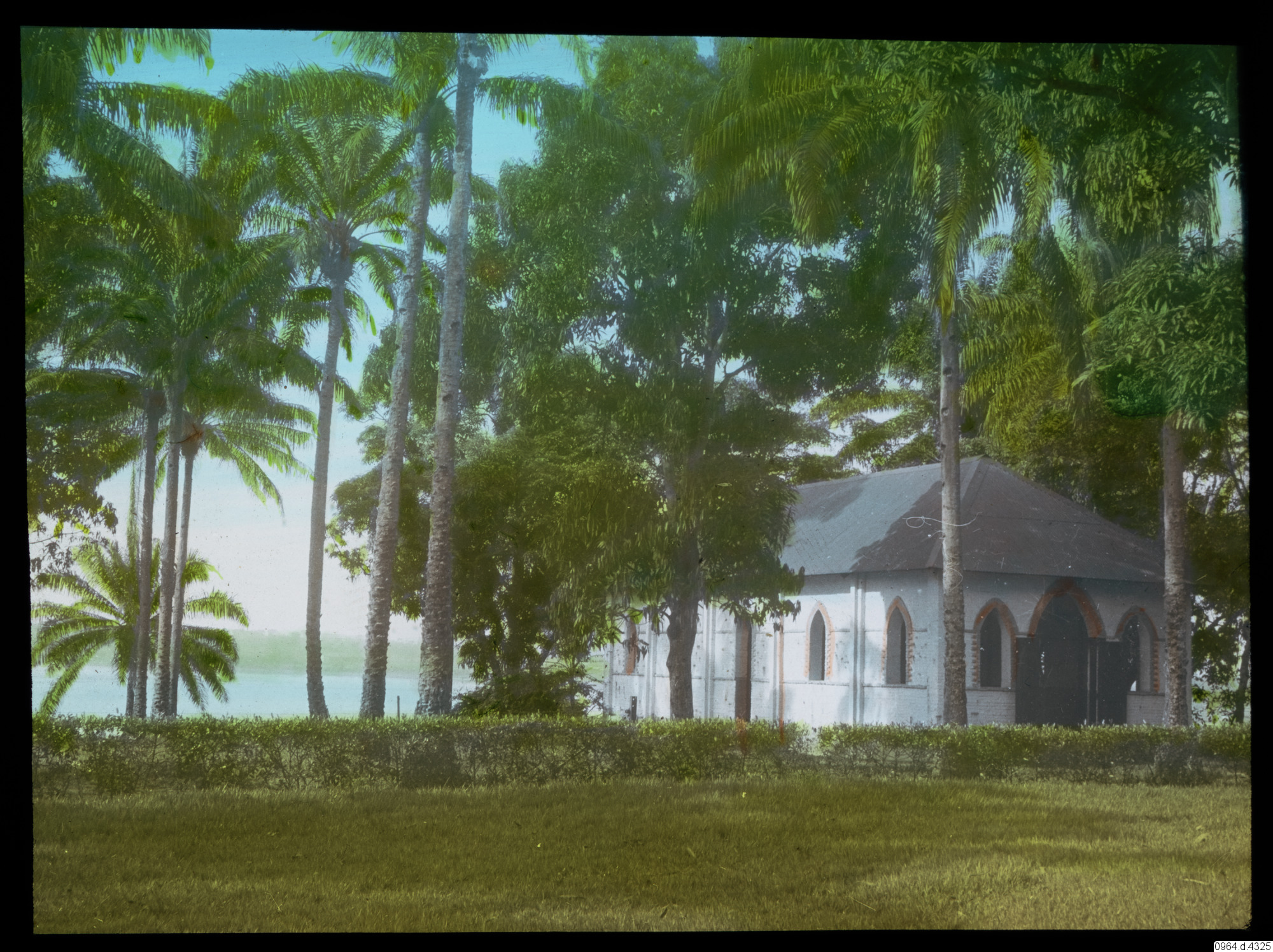 Kyrkobyggnad bland palmer med vatten i bakgrunden