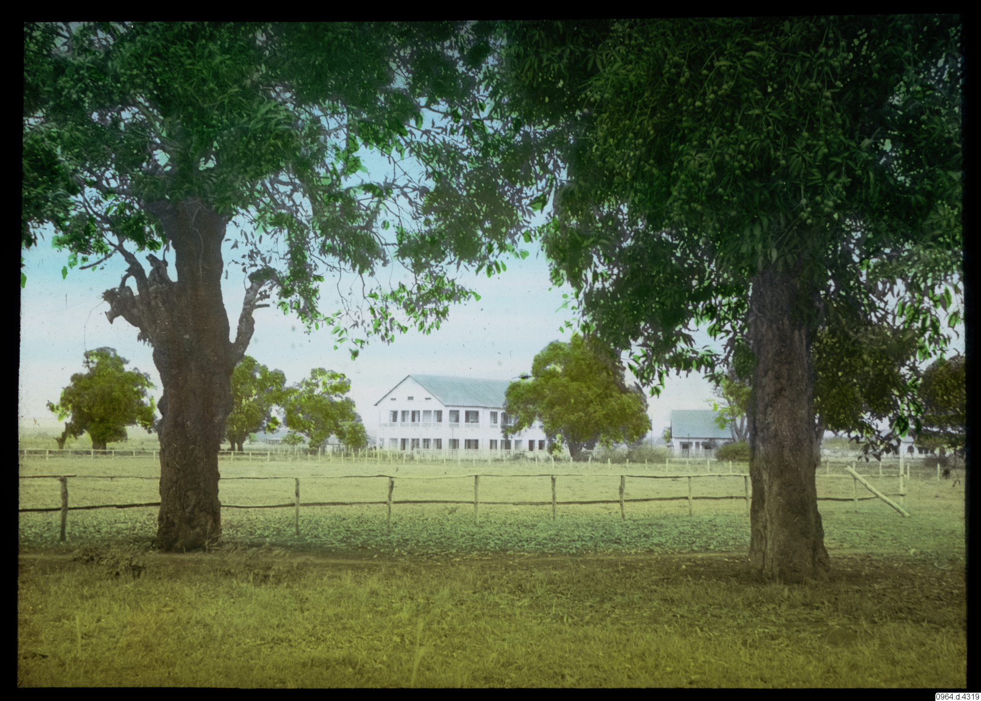 Stora träd, en inhägnad och missionstation i bakgrunden.