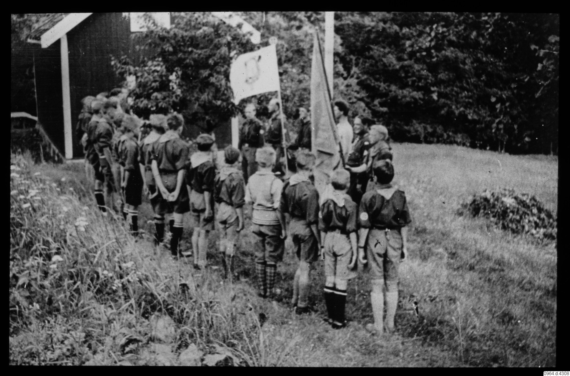 Ungdomar i uniform uppställda framför ledare och flagga.