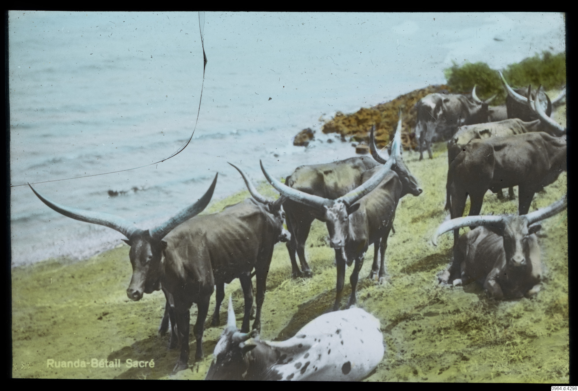Boskap, med stora låga horn, vid strand. Ruanda - Bétail Sacré. (Helig boskap).