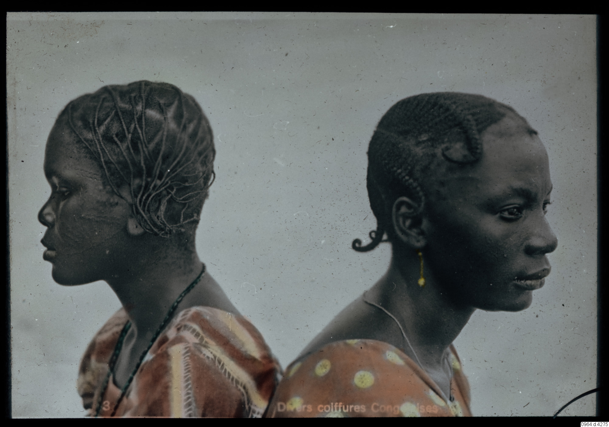 Porträtt av två kvinnor, smycken och flätade frisyrer. En med med ärrtatueringar i ansiktet. Text: Diverses coiffures Congolaises/Africaines.