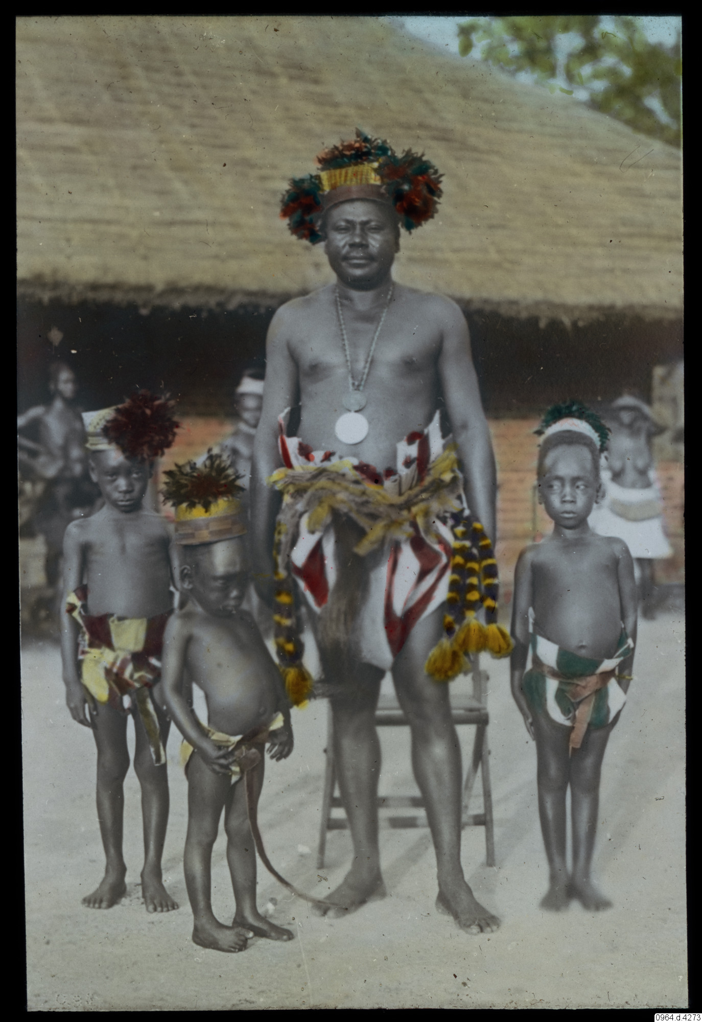 Hövding med medaljer samt fjäderprydd huvudbonad och småpojkar med liknande huvudbonader. Niapu. Le grand chef Okondongo. Pr. Or. Le Grand Chef Okodongwe.