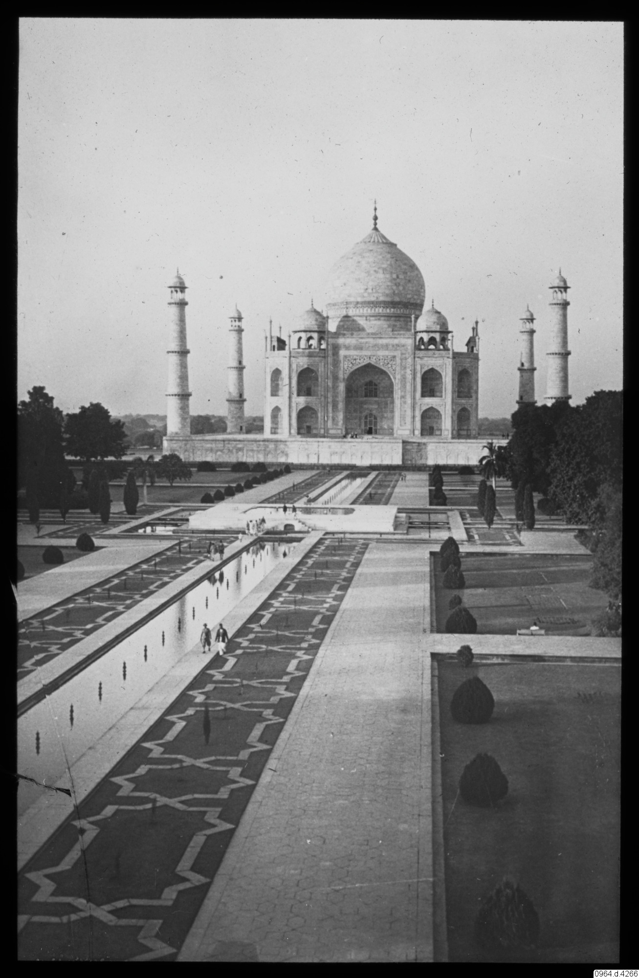 Taj Mahal. Agra. (Mausoleum uppfört av mogulhärskaren Shah Jahans över älsklingshustrun Mumtaz Mahal. Byggt mellan 1632 och cirka 1643, i kombination av muslimsk och indisk arkitektur.)