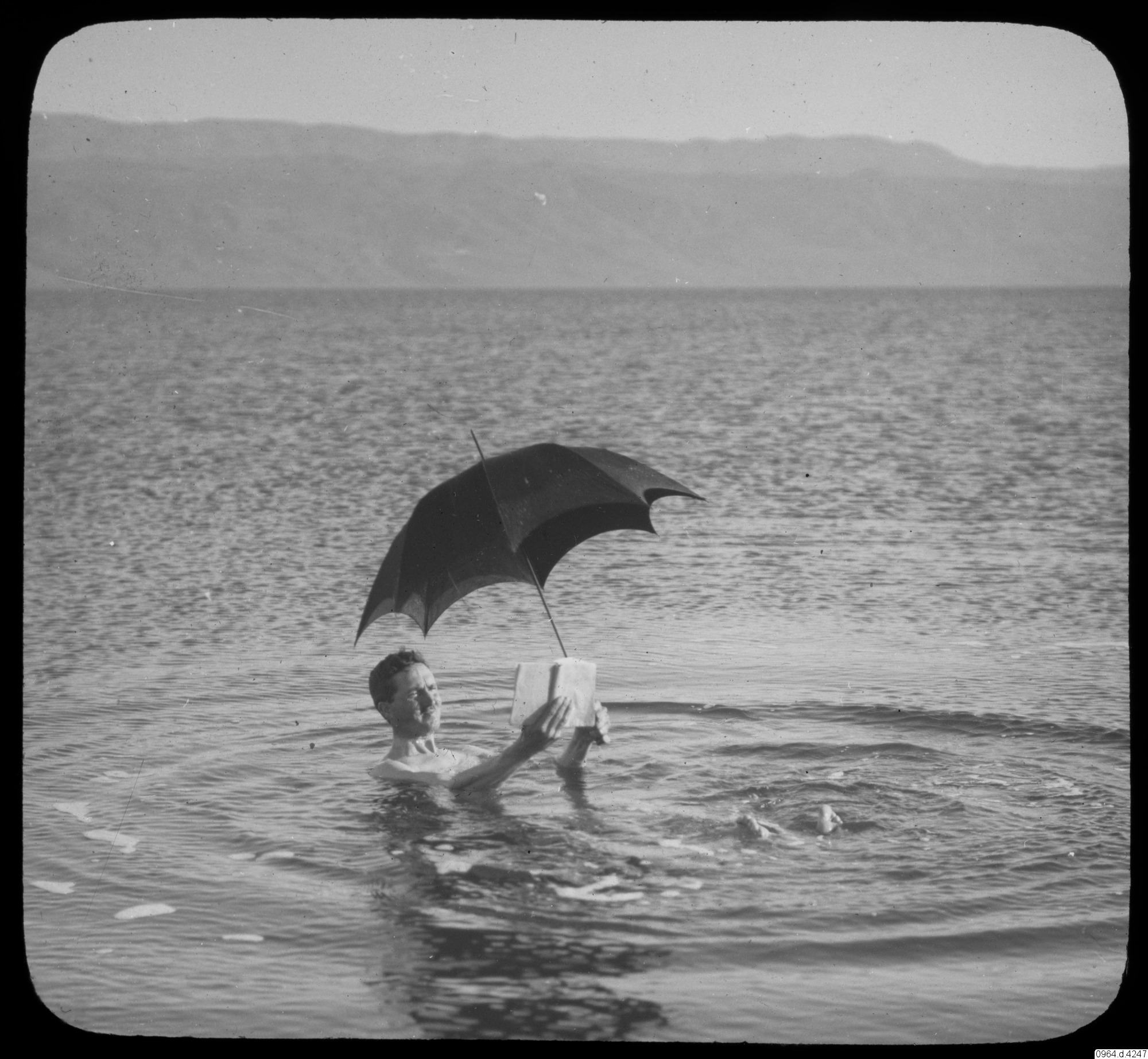 On Dead Sea. På Döda havet, badar flytande med bok och parasoll.