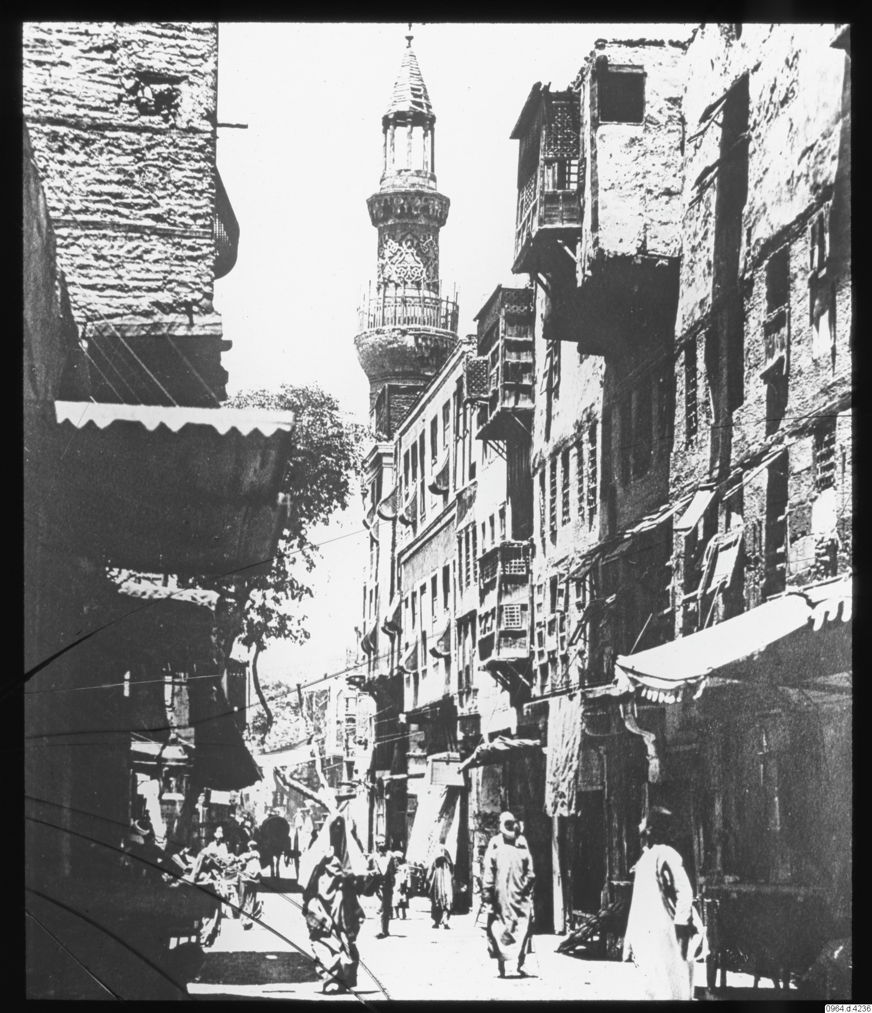 Tusen mil uppför Nilen. Gata i Kairo. Al-Surujiyya gatan och minareten till Mausoleum moskén för mamluk Amir Janim al-Bahlawan. 1890 ca. Rue el-Souroughien, moskén byggdes 1478-1510.
