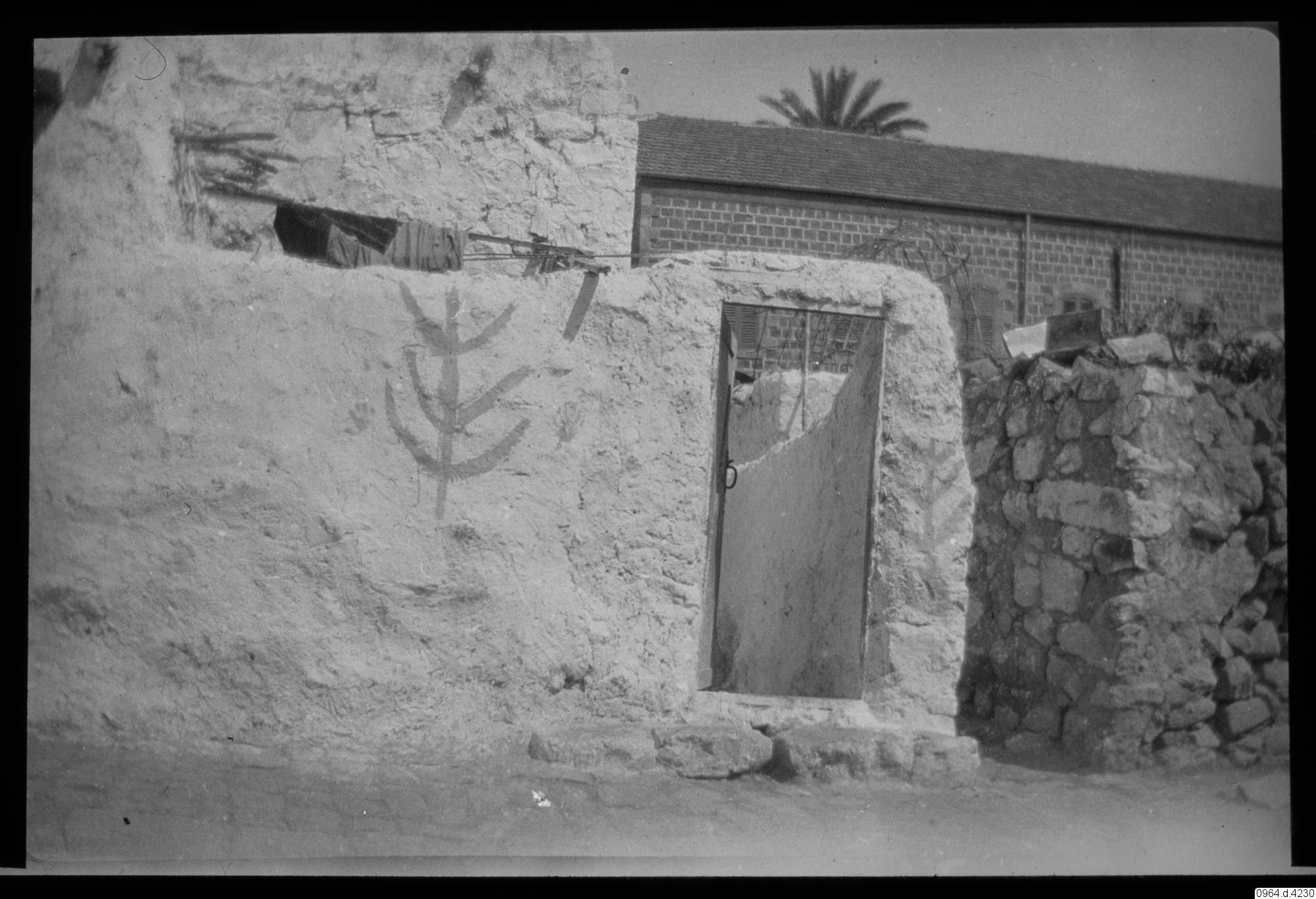 Mur med väggmålning. symbol, rester av ett hus? Nyare byggnad bakom.