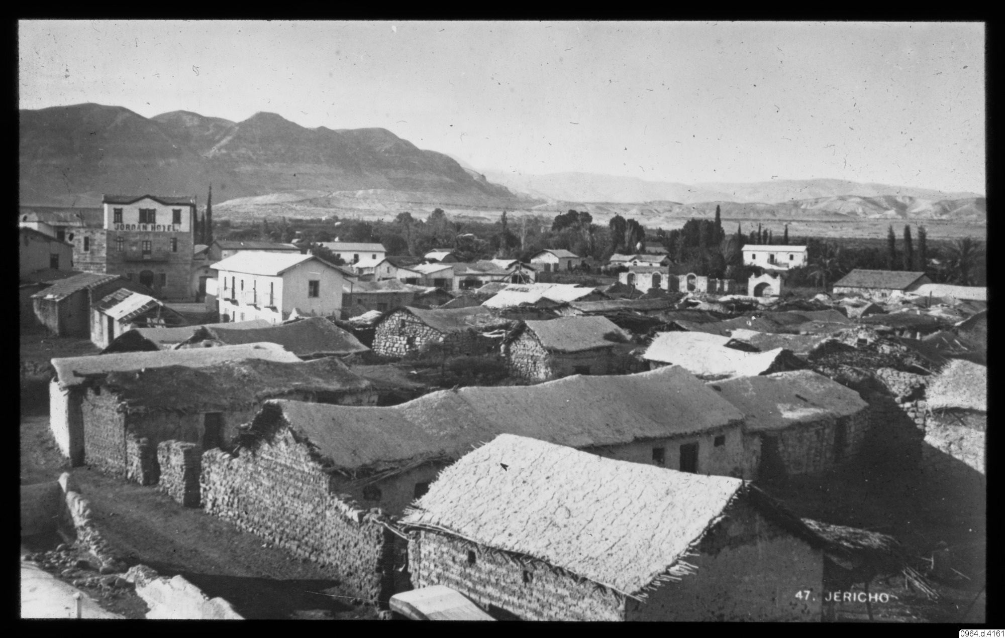 Palestina. Jeriko. Hotell Jordan och andra byggnader runt Tell es-Sultan/Gamla Jeriko. Endast en kulle var synlig, där har flertalet arkeologiska utgrävningar skett . Redan runt 8200 år före Kristus fanns en stenmur runt bosättningen. Rester av över 20 olika städer, på varandra i kullen, har hittats.
