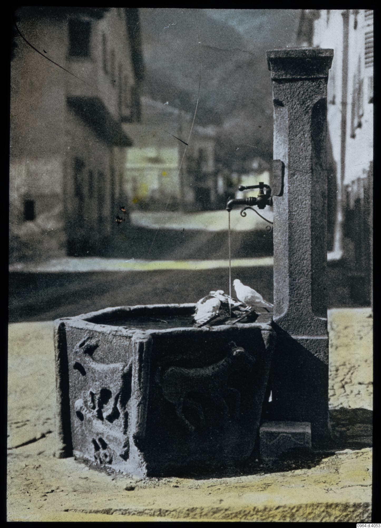gata, brunn, byggnader, duvor, fåglar, fotografi, photograph