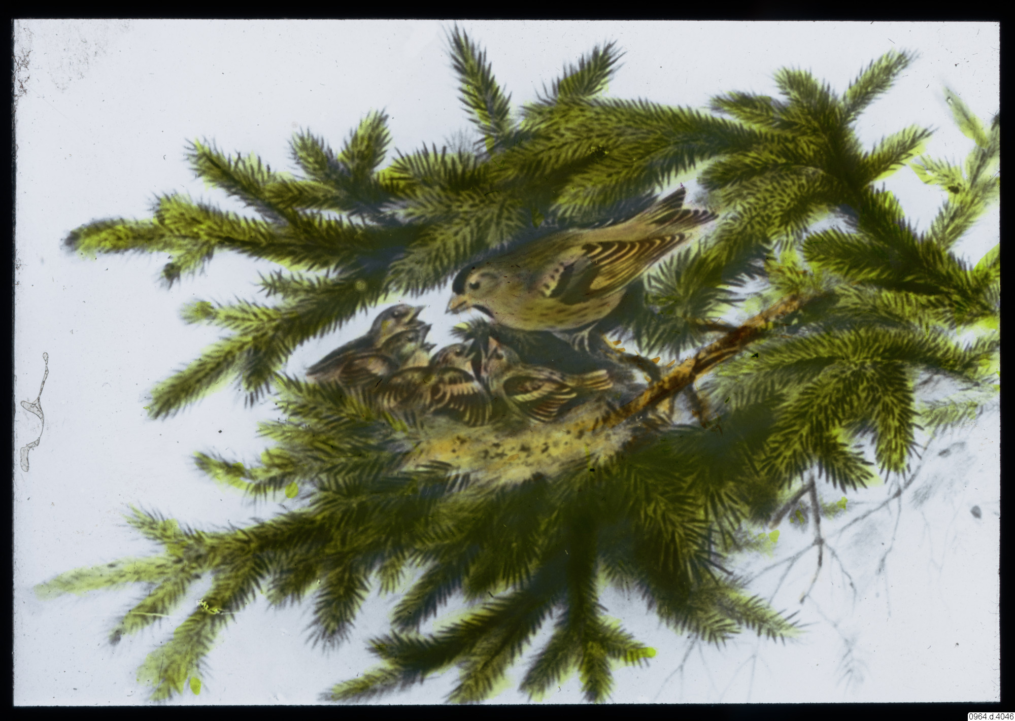 93. Grönsiska med ungar i boet. Om fågelmat och fågelholkar s. 12.