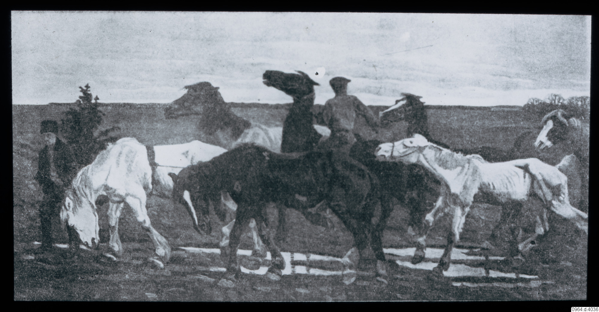 Utkörda hästar. Begravningsmarsch, Marche funèbre, av Rosa Nordenskjöld (1890-1950). Gamla uttjänta hästar på väg till slakthuset i Paris. 1909?