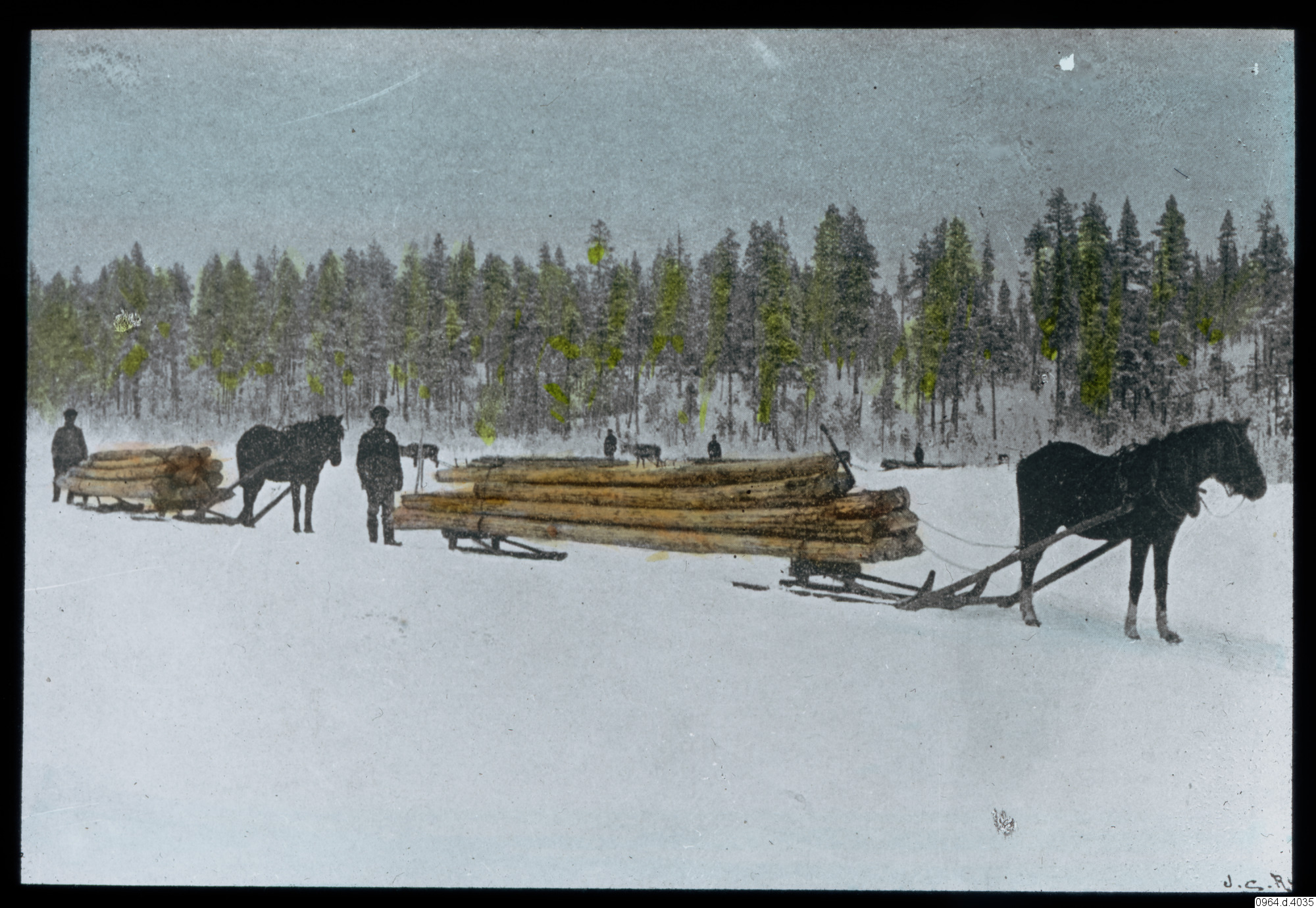 seldon, hästar, gruppbild, timmer, släde, fotografi, photograph