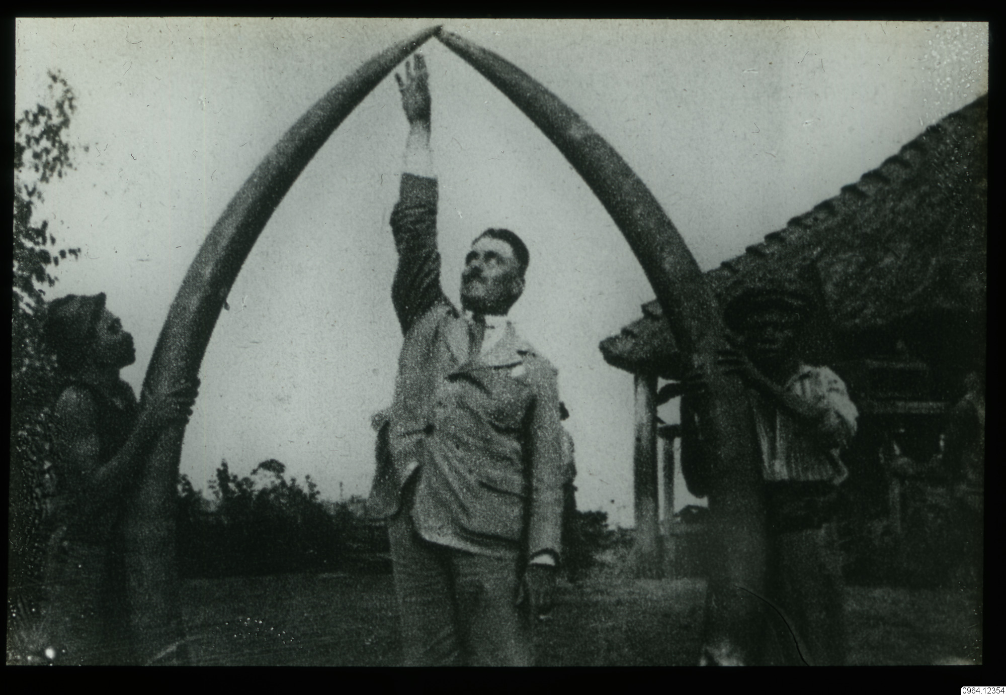 Man som står mellan två elfenben (elefantbetar) och räcker upp handen.