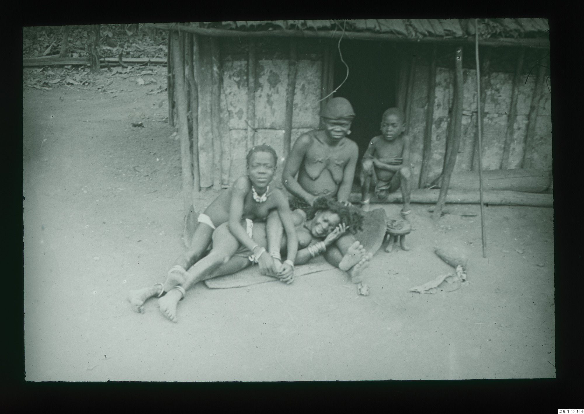 Utanför en hydda sitter och ligger flera personer på en matta. De har fotringar. En liten pall står bredvid.