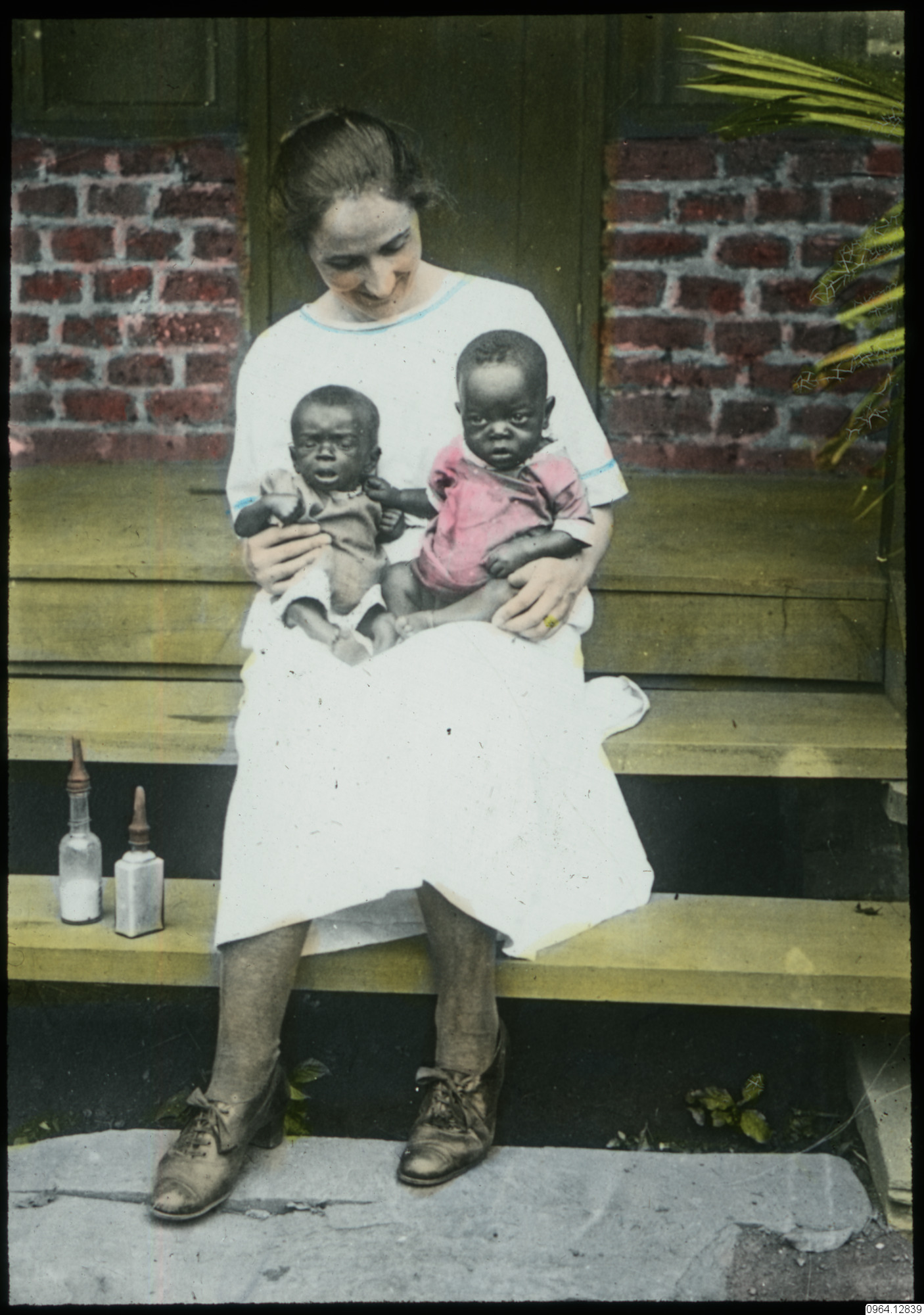 Kvinna (missionär, sjuksköterska) som sitter på trappa med två små barn. Bredvid står två flaskor, sannolikt med mjölk eller mjölkersättning.