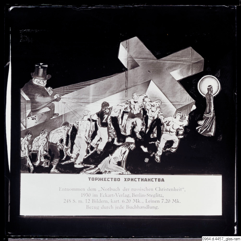 Rysk text "Triumf av kristendomen". Källa: Tysk. Hämtad från "Notbuch der russischen Christenheit" Nödbok för rysk kristendom. Publicerat 1930 av Eckhart Verlag i Berlin Steglitz. Illustration av Dmitry Moor, 1925, Ryssland. (Dmitry Stakhievich Orlov)