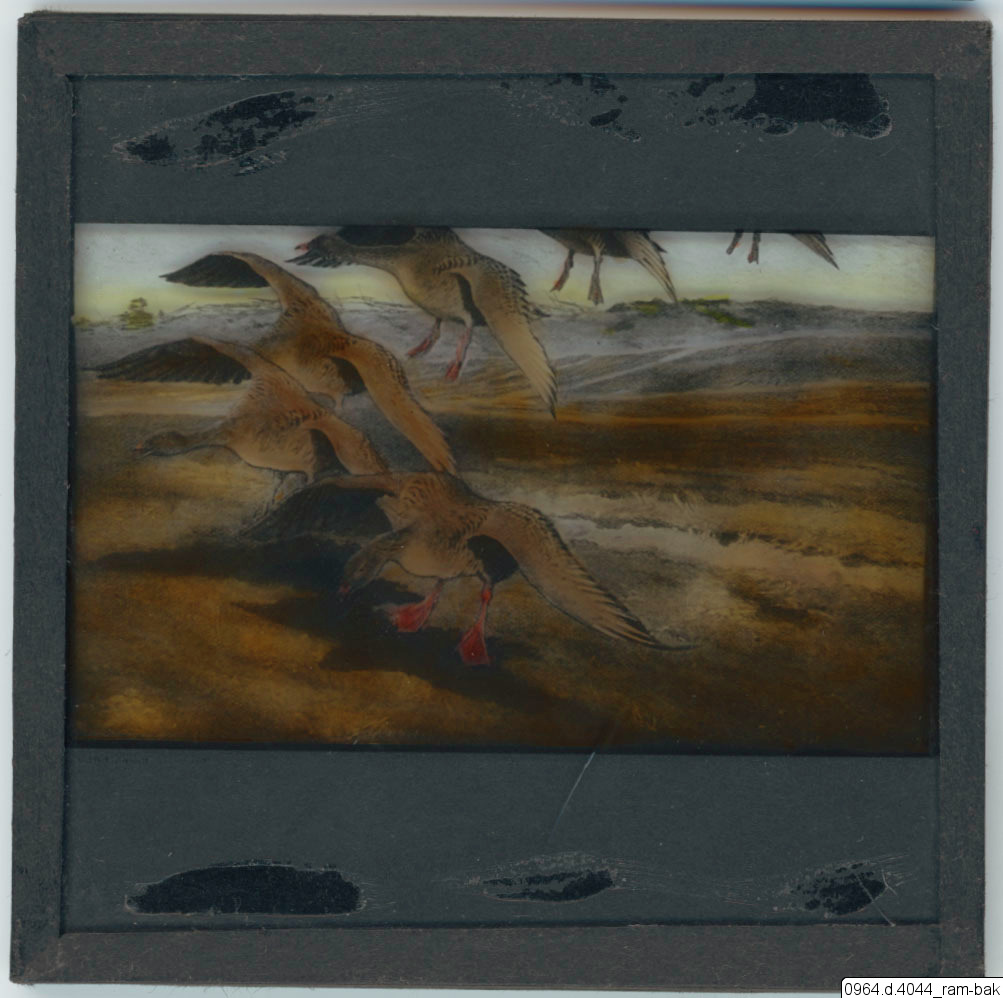 Repro av målning. 1. Vildgäss, Nationalmuseum (eller Thielska?). (Bruno Liljefors, 1905.) Användes i Selma Lagerlöfs bok Nils Holgerssons underbara resa genom Sverige, band 1, 1906.