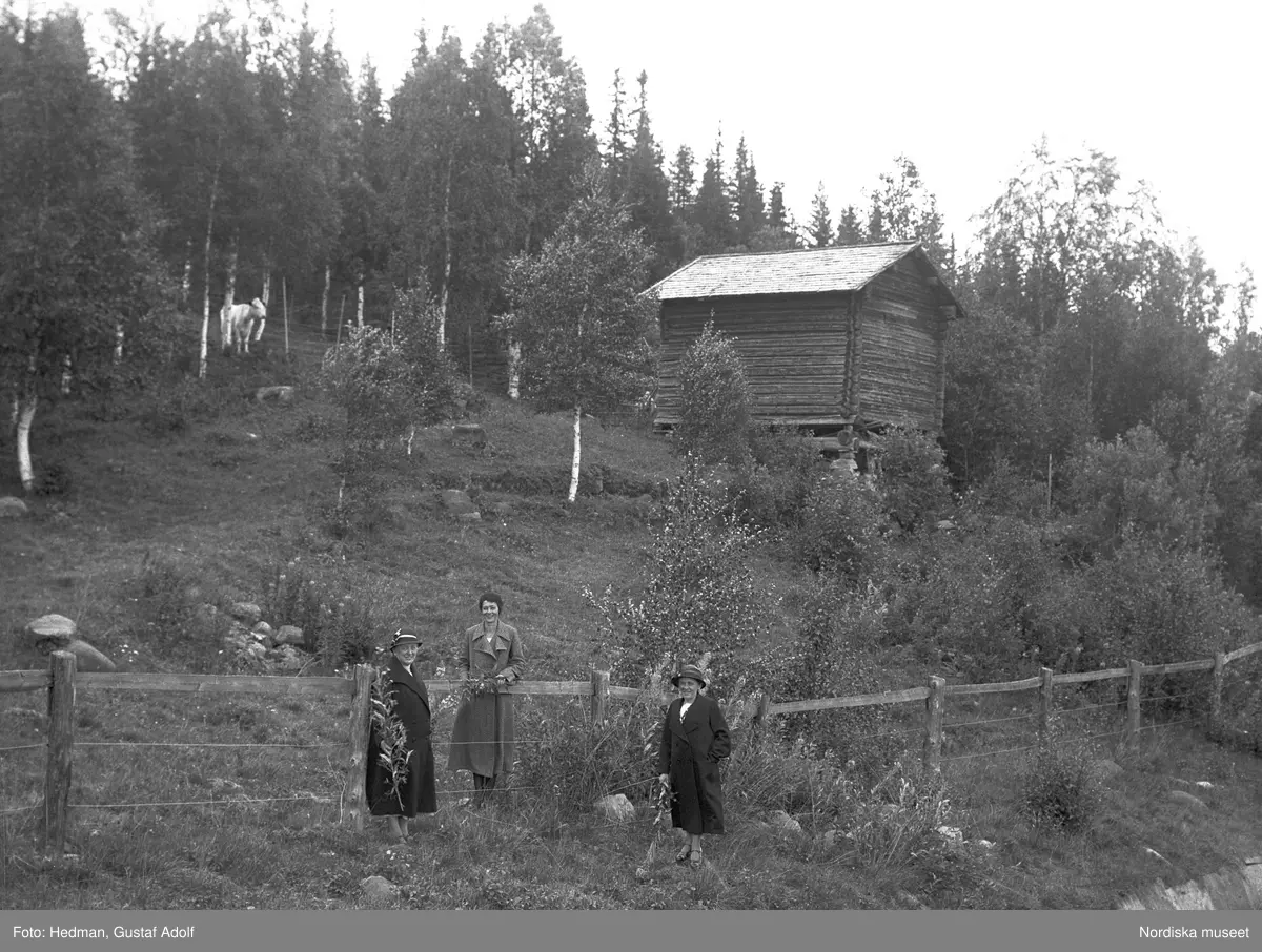 Tre kvinnor vid staket nedanför timmerlada. En fjällko skymtar mellan träden.