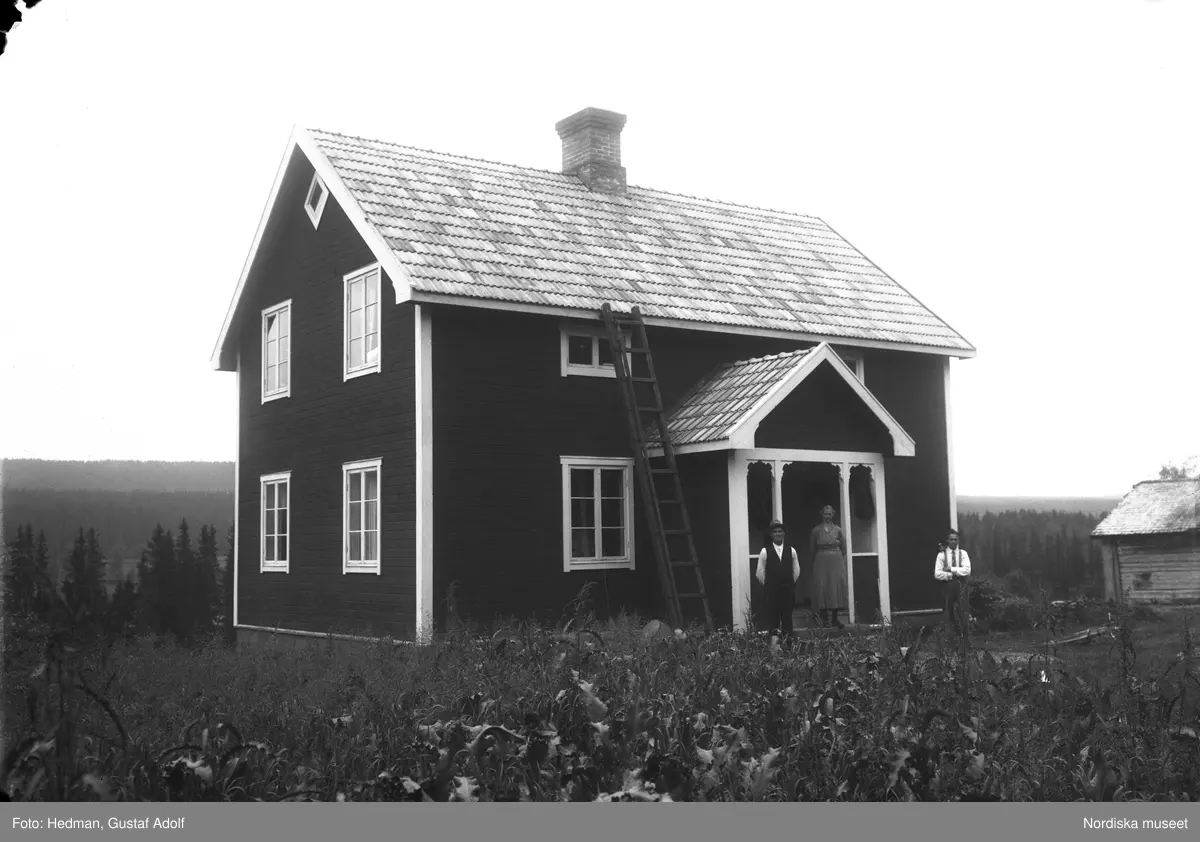 August Hurtigs fastighet i Mornäs. August, Lovisa och Anders Hurtig framför huset.