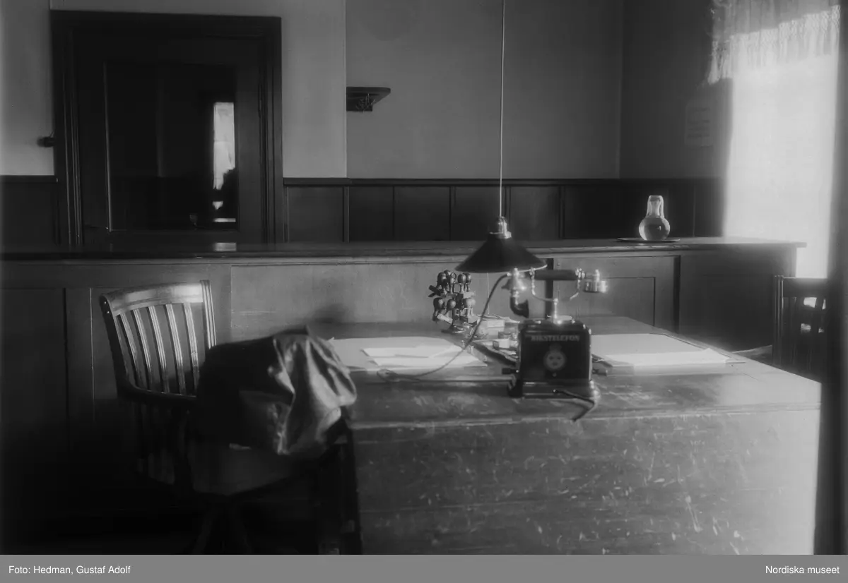 Göteborgsbankens kontor i Johan Larssons fastighet. På bordet telefonen med texten "Rikstelefon" och stämplar.