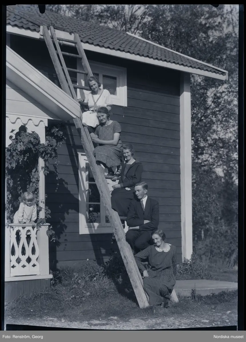 Fyra unga kvinnor och en man poserar sittandes på en stege uppställd mot taket på ett hus.