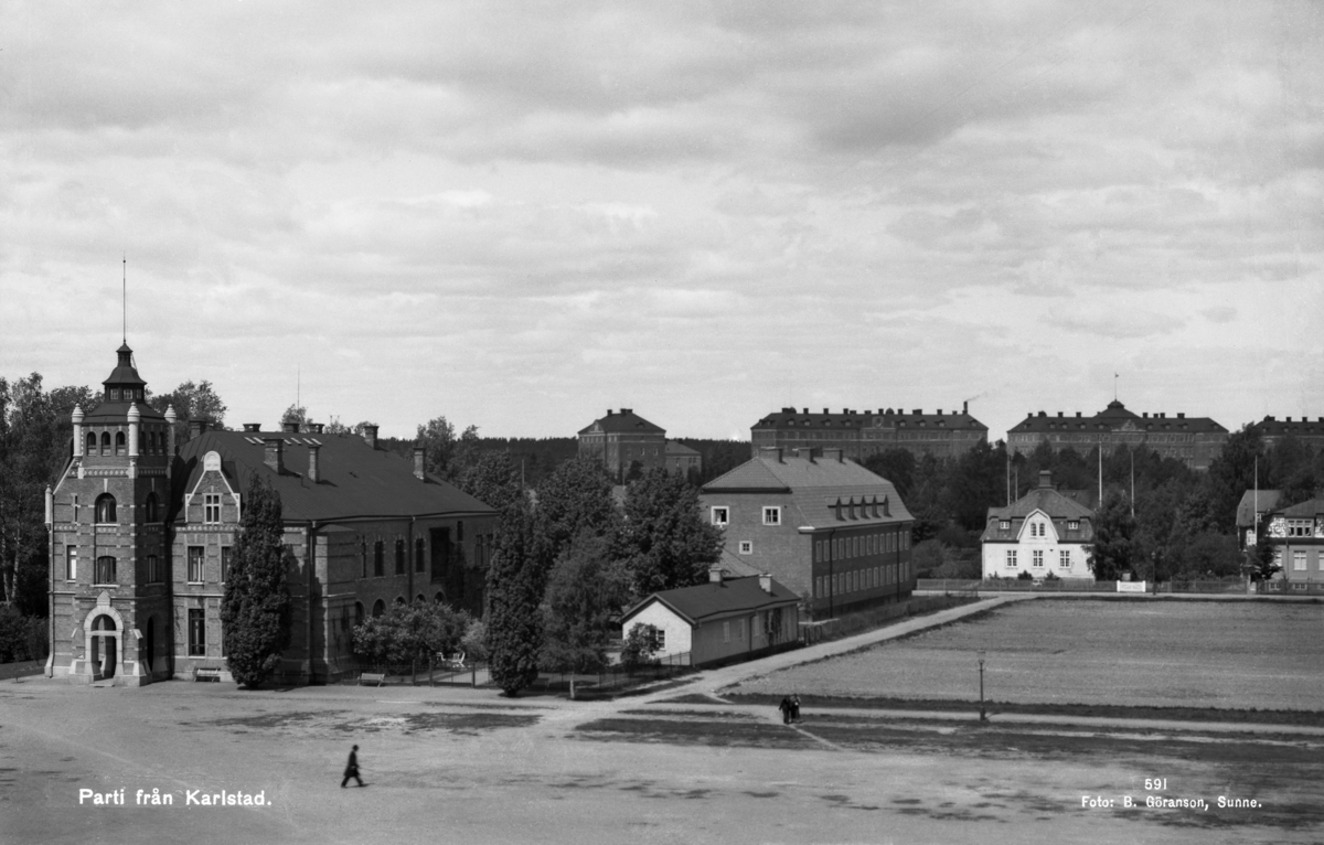 Tingshuset och Malmgården med regementet i bakgrunden. Bilden tagen i början av 1930-talet.