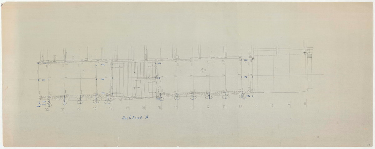 Titel: Skånegården. Norra log- och ladlängan. Fasadritning. Hus L. Fasad A.