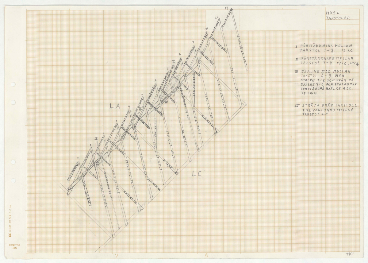 Titel: Skånegården. Norra log- och ladlängan. Detaljritning. HUS L. TAKSTOLAR.