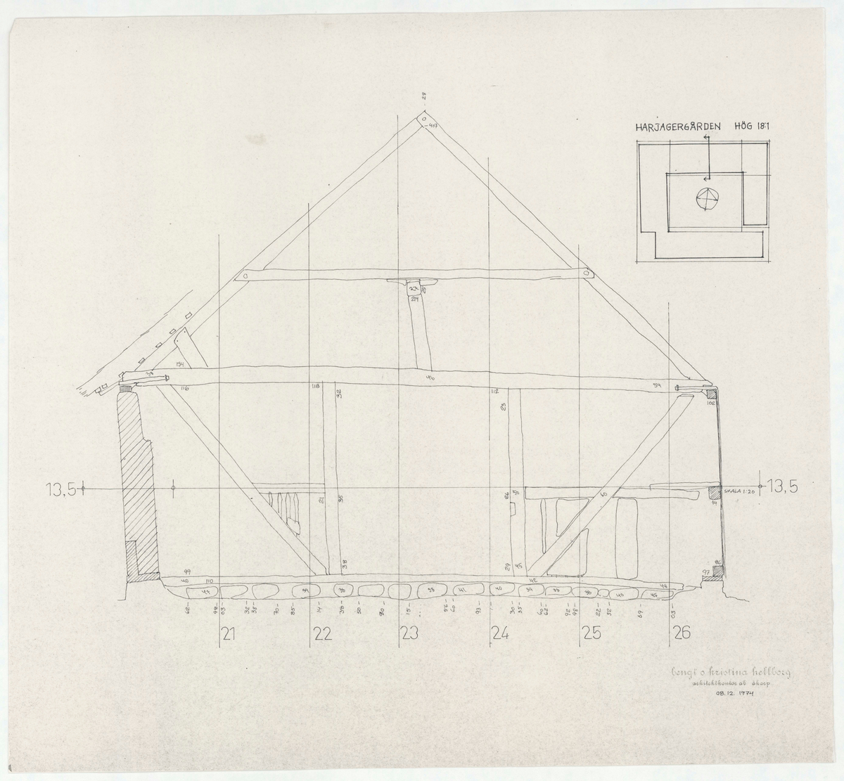 Titel: Skånegården. Norra log- och ladlängan. Sektionsritning.