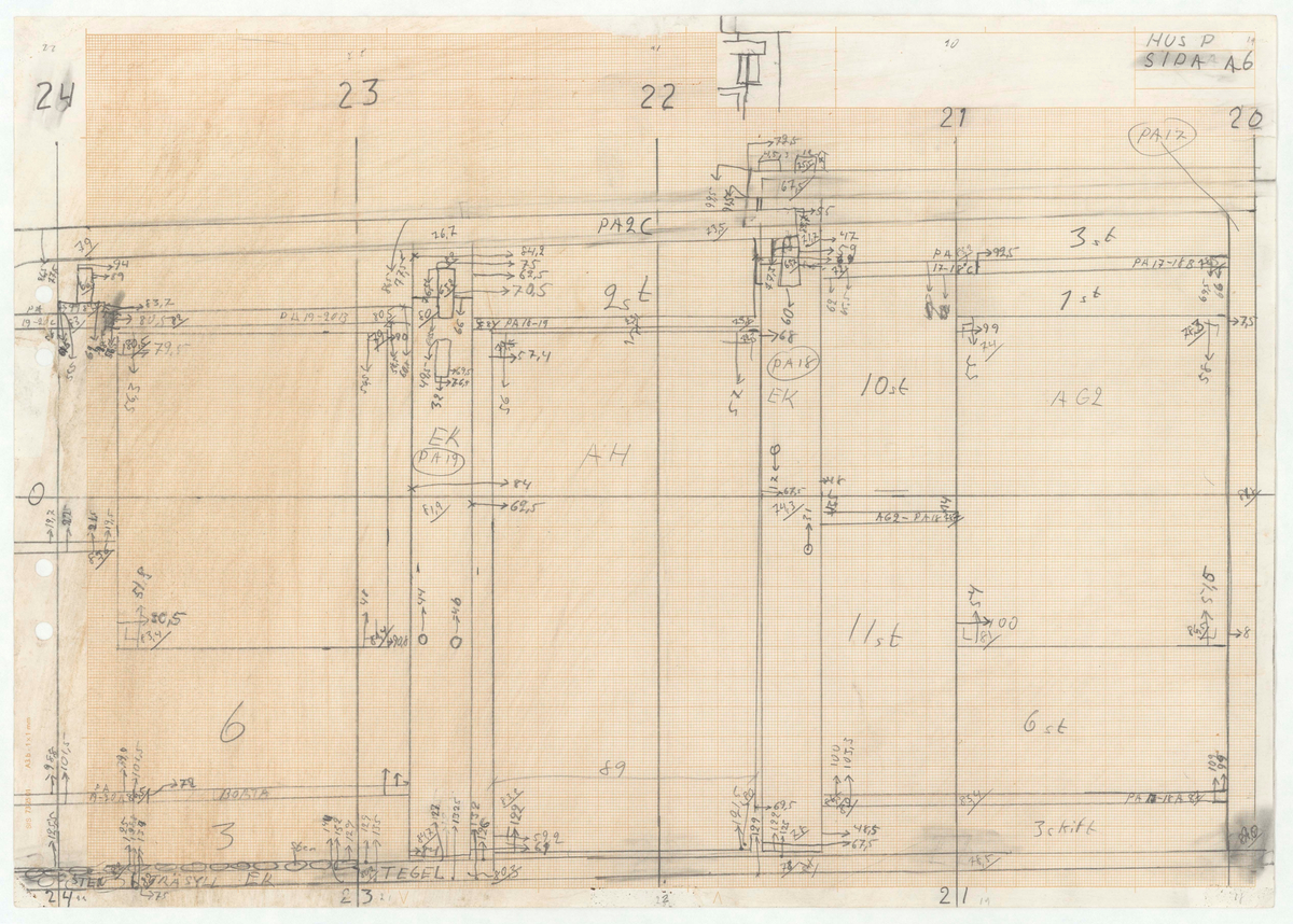 Titel: Skånegården. Bostadshuset. Detaljritning. HUS P. SIDA A6.