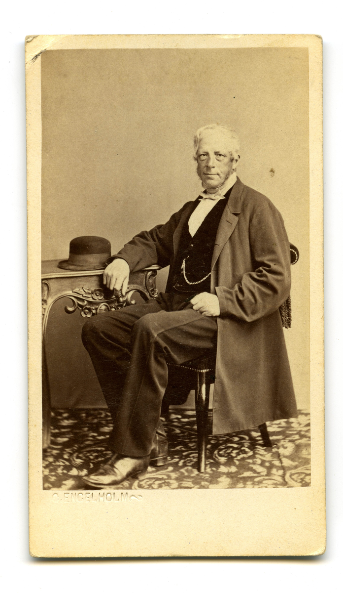 Porträtt på en man i helfigur, sittande vid ett bord.