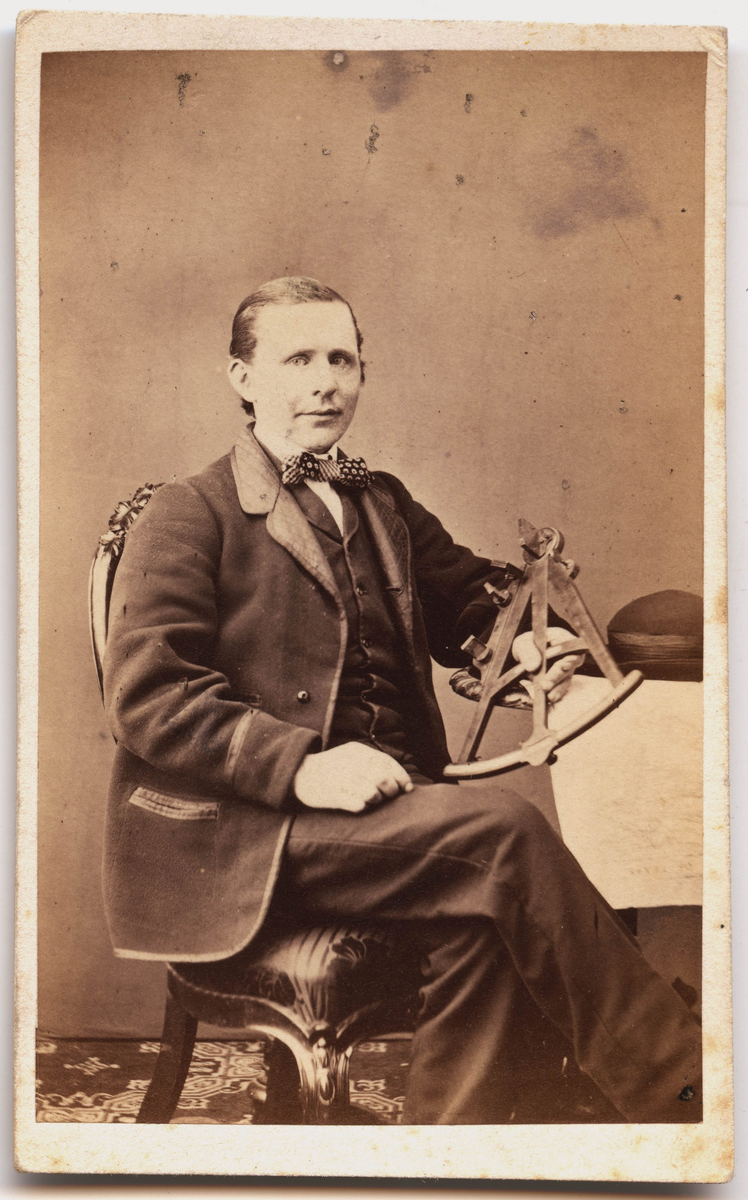 Porträtt på en sittande man i helfigur, med mätinstrumentet oktant i handen.